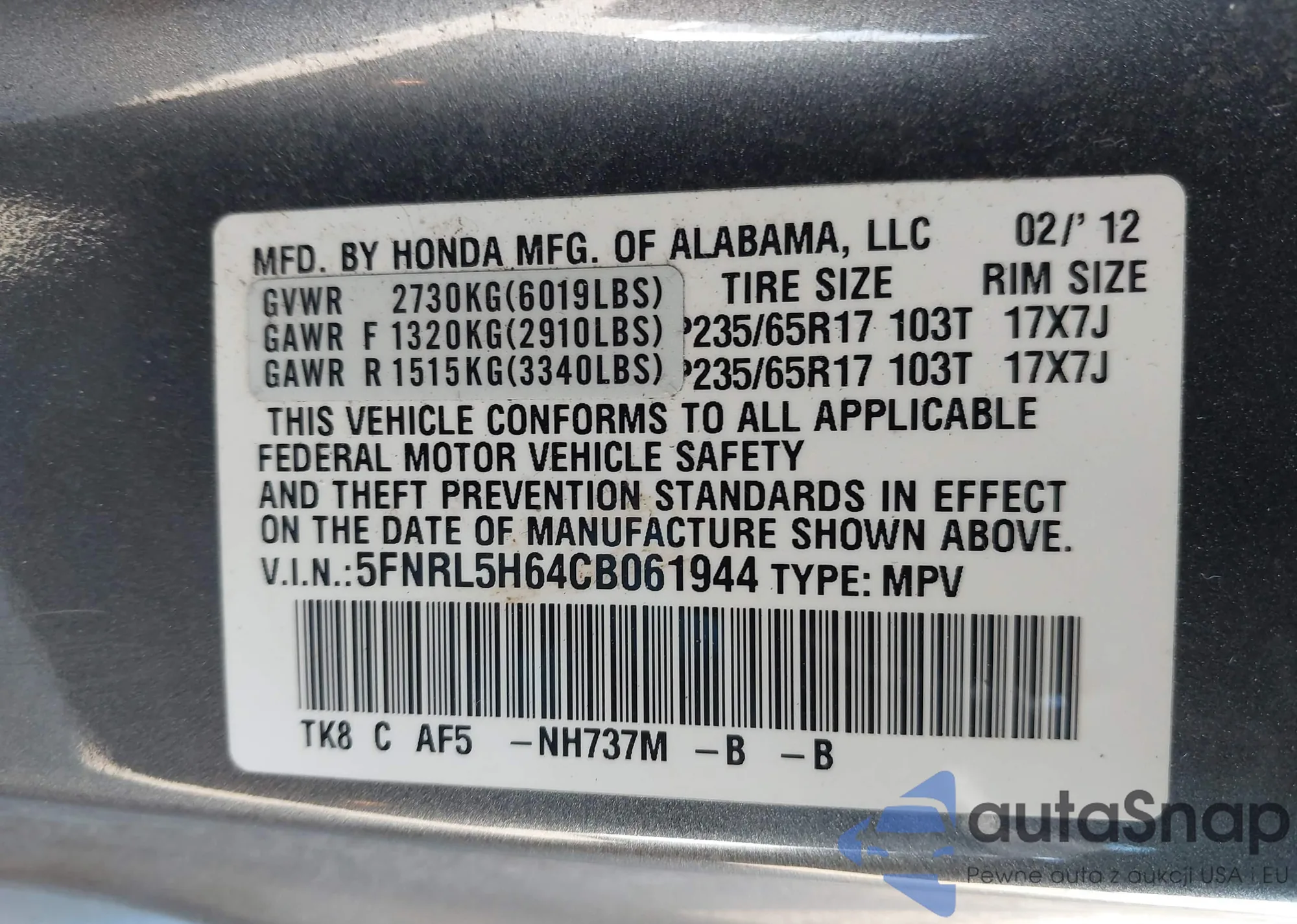 VIN: 5FNRL5H64CB061944