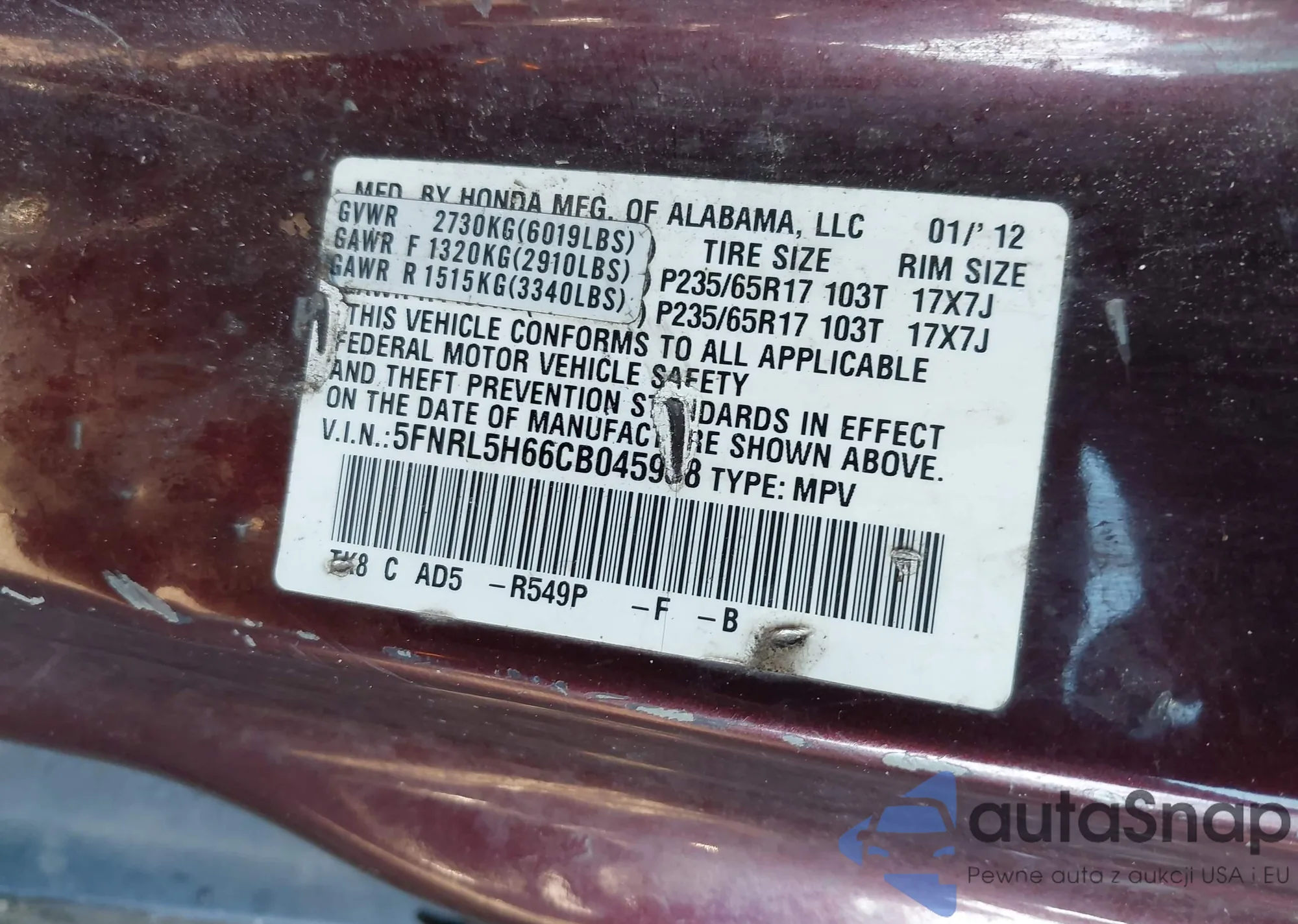 VIN: 5FNRL5H66CB045938