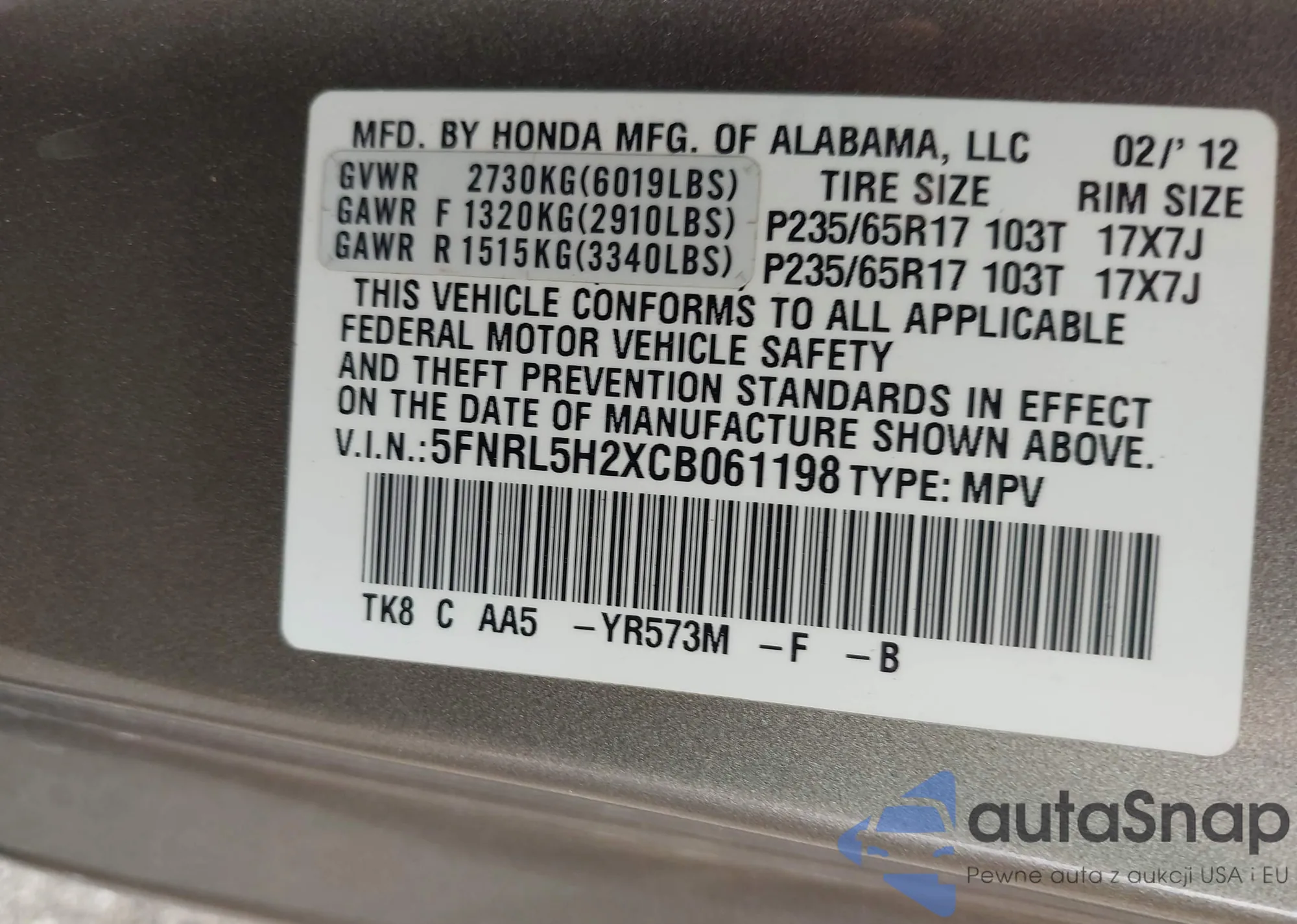 VIN: 5FNRL5H2XCB061198