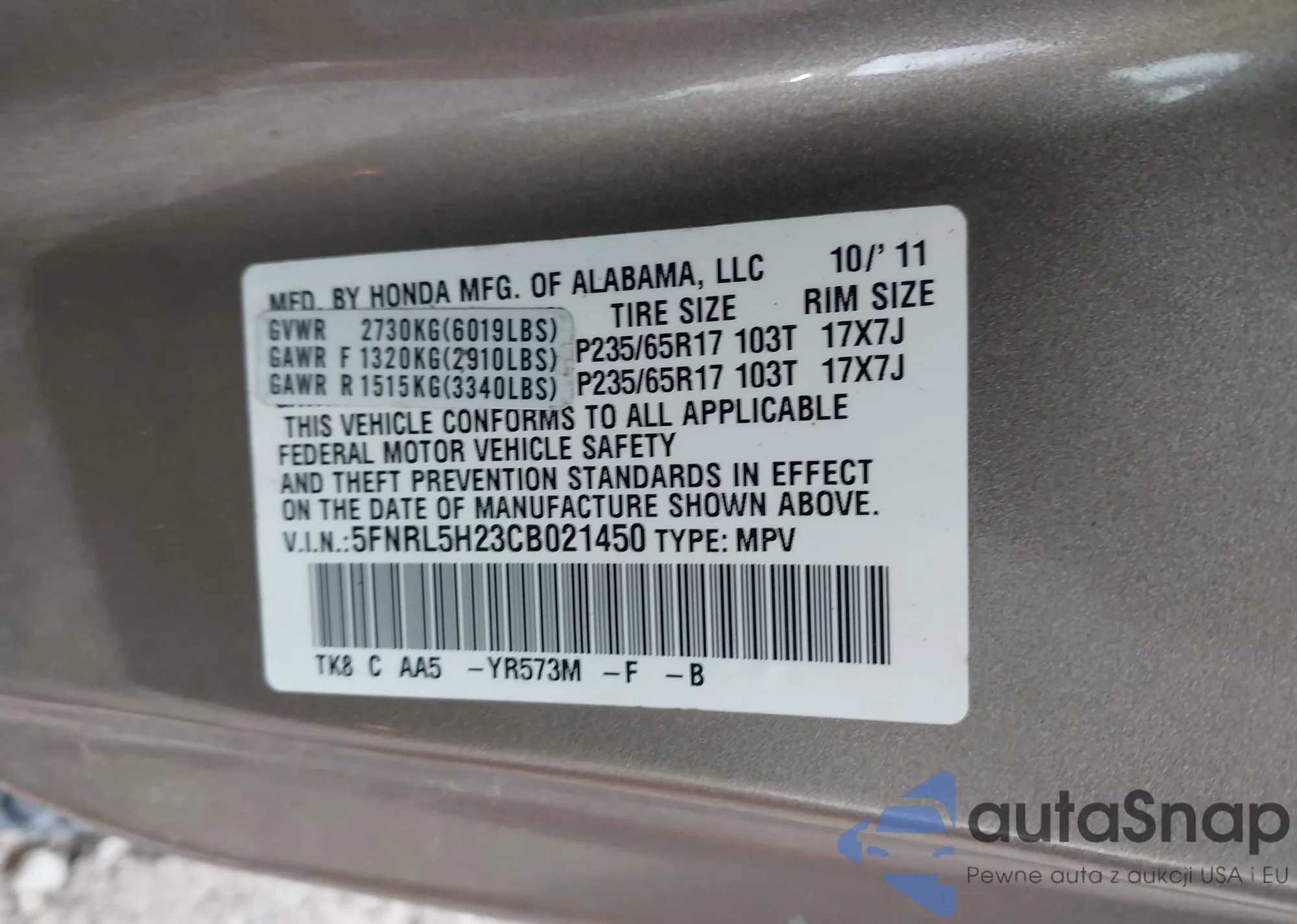 VIN: 5FNRL5H23CB021450