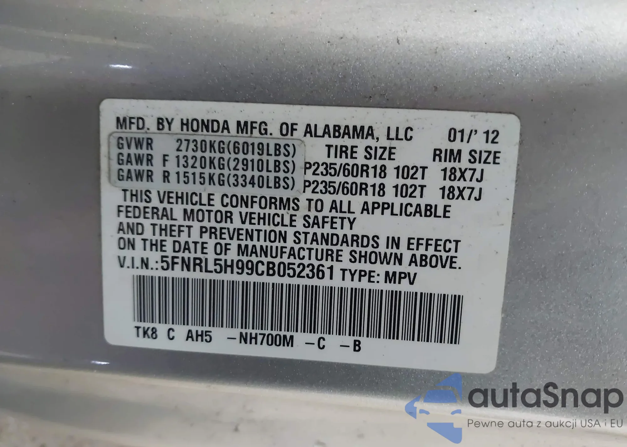 VIN: 5FNRL5H99CB052361