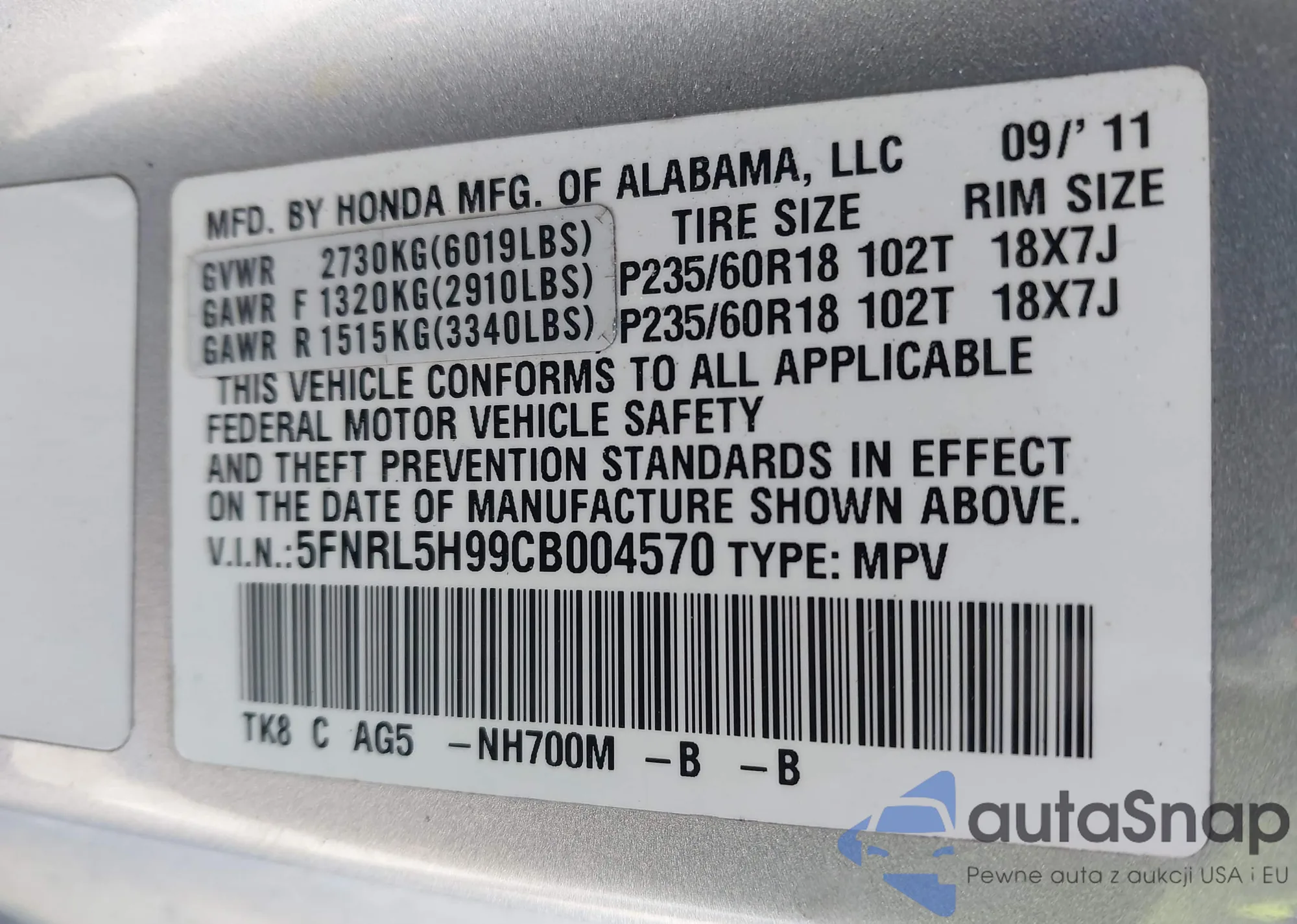 Samochód Honda Odyssey 2012 (VIN 5FNRL5H99CB004570) nie był wcześniej licytowany. Dokumenty są czyste, przebieg odpowiada lub jest niższy niż średnia rynku. Sprzedaje go firma ubezpieczeniowa – polecamy zakup. Dostawa do portu zajmie ok. 6–8 tygodni.
