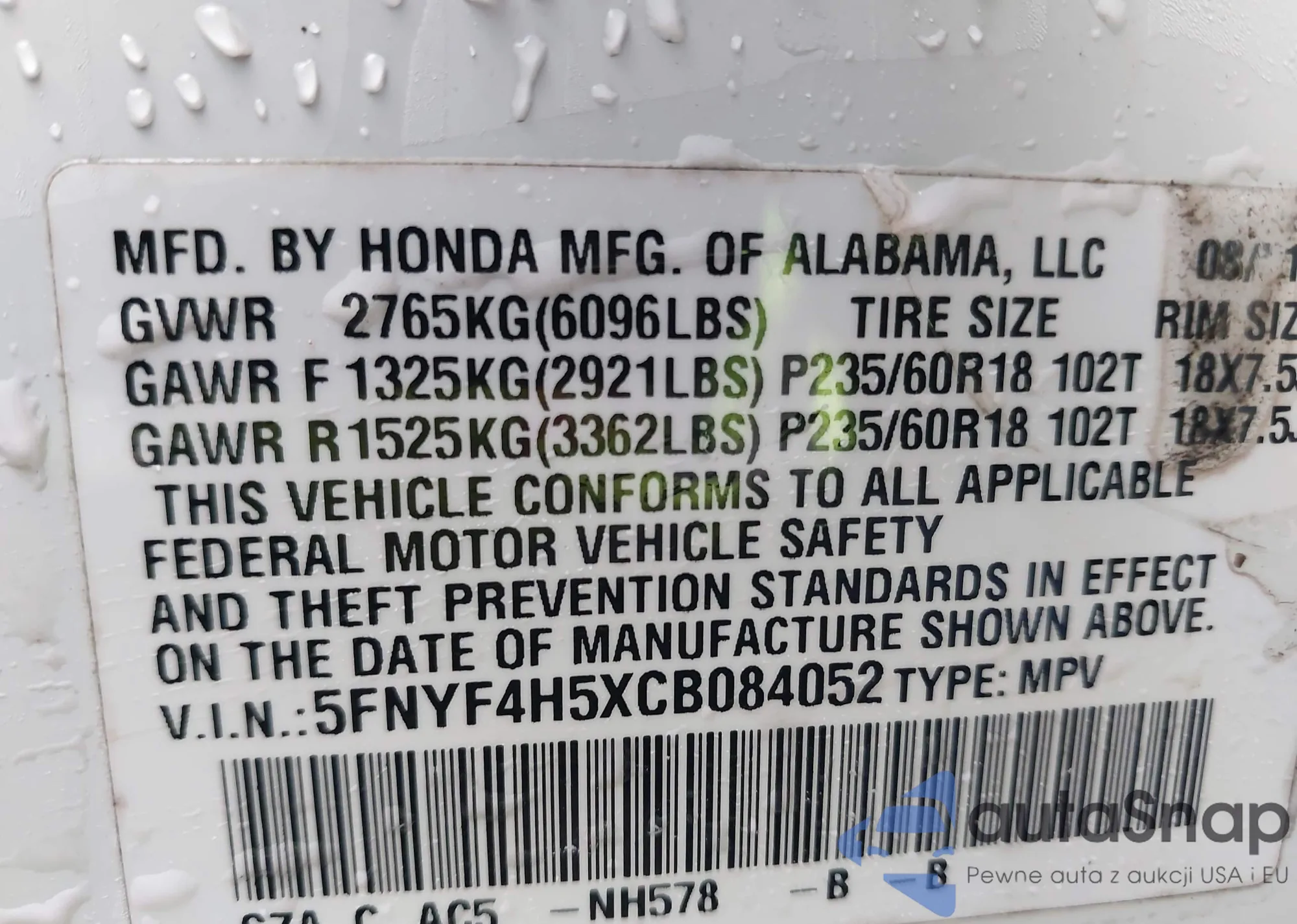 VIN: 5FNYF4H5XCB084052