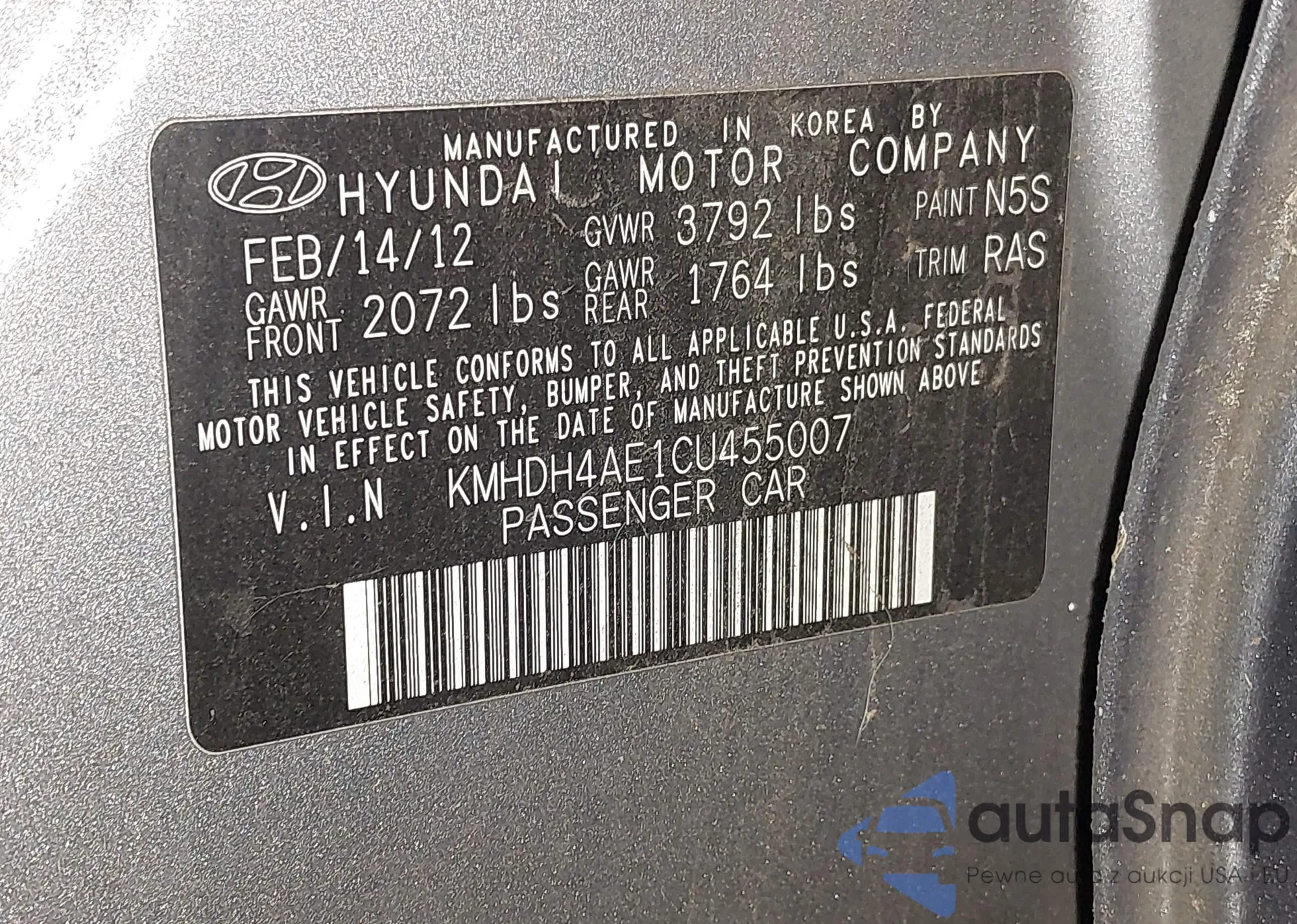 • VIN: KMHDH4AE1CU455007