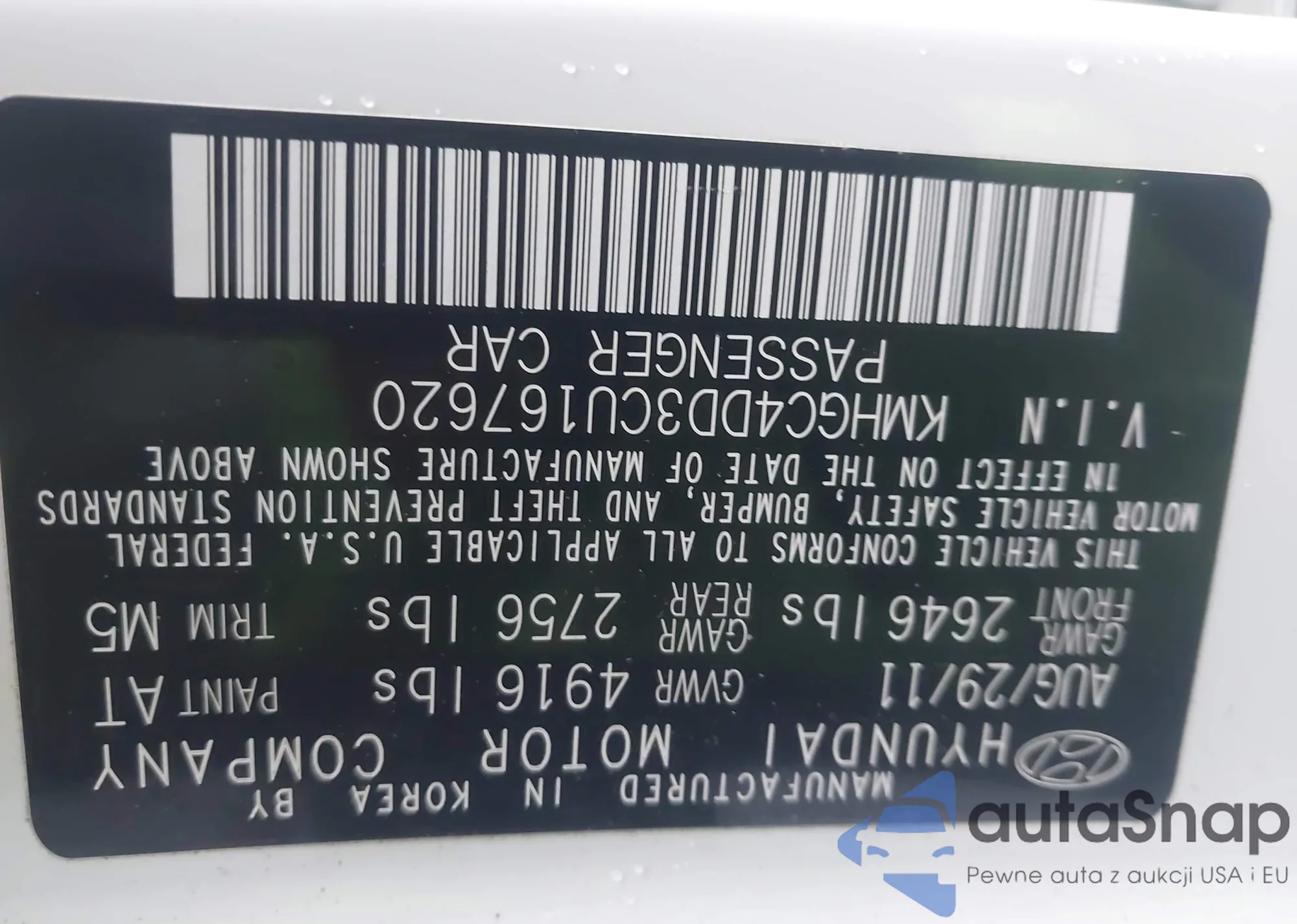 • VIN: KMHGC4DD3CU167620