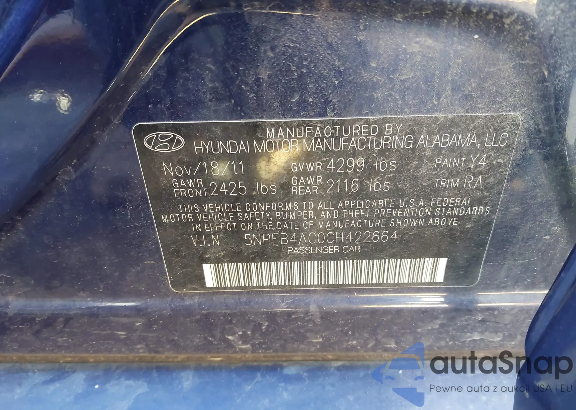 Samochód Hyundai Sonata 2012 (VIN 5NPEB4AC0CH422664) nie był wcześniej licytowany. Dokumenty są czyste, przebieg odpowiada lub jest niższy niż średnia rynku. Sprzedaje go firma ubezpieczeniowa – polecamy zakup. Dostawa do portu zajmie ok. 6–8 tygodni.