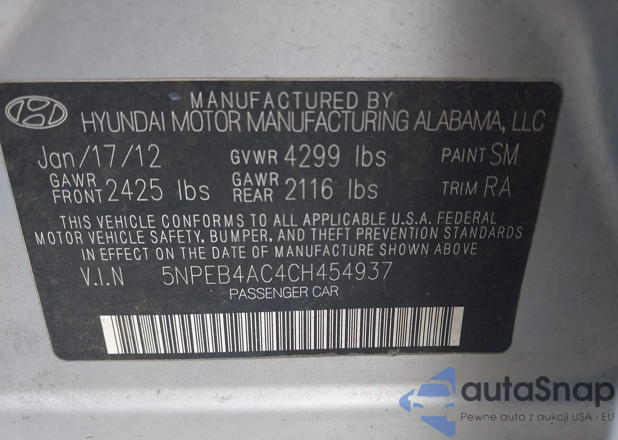 VIN: 5NPEB4AC4CH454937