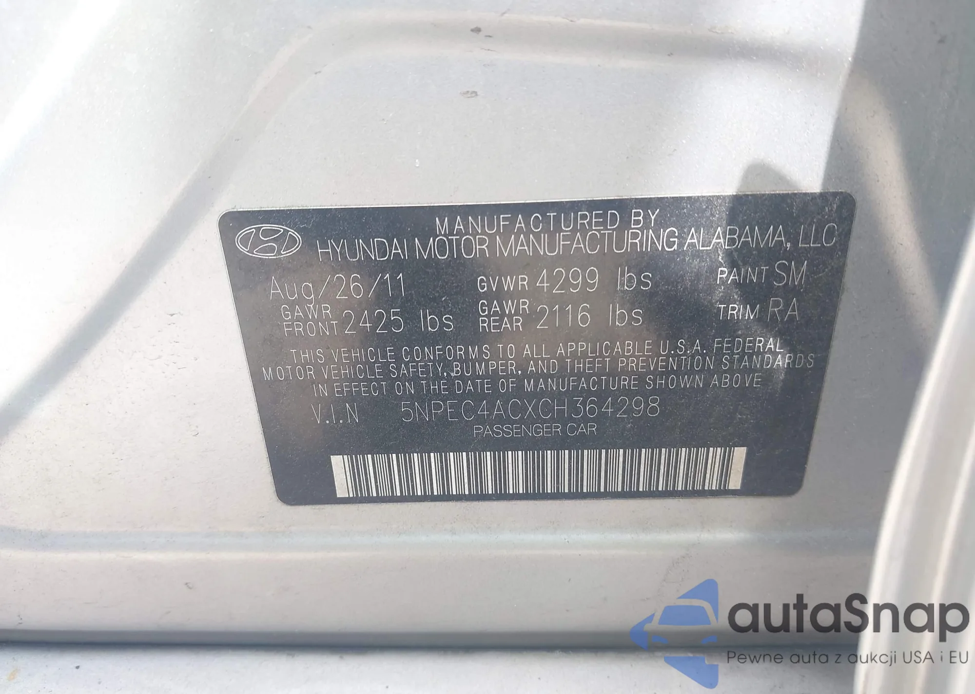 Samochód Hyundai Sonata 2012 (VIN 5NPEC4ACXCH364298) nie był wcześniej licytowany. Dokumenty są czyste, przebieg odpowiada lub jest niższy niż średnia rynku. Sprzedaje go firma ubezpieczeniowa – polecamy zakup. Dostawa do portu zajmie ok. 6–8 tygodni.