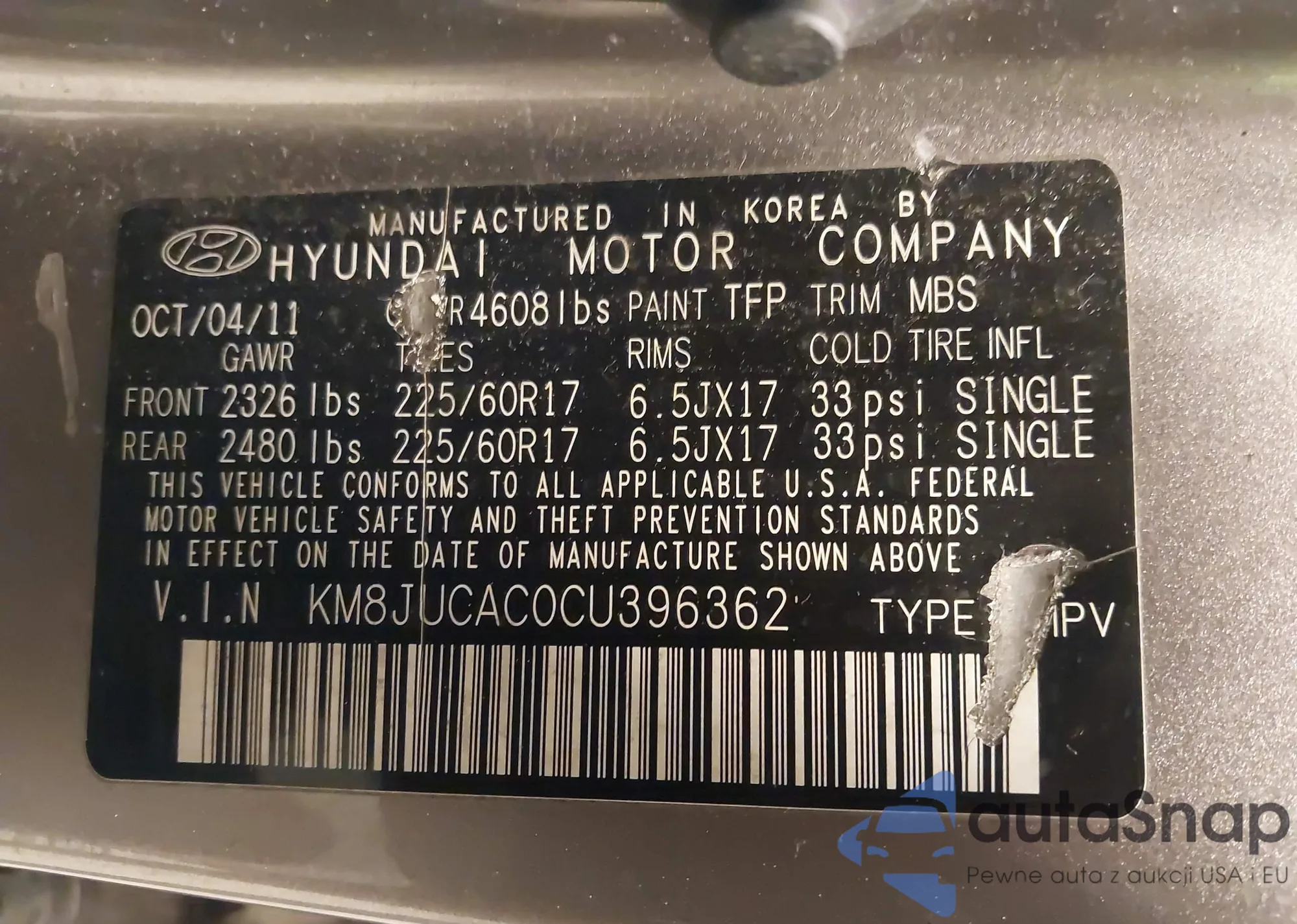 VIN: KM8JUCAC0CU396362