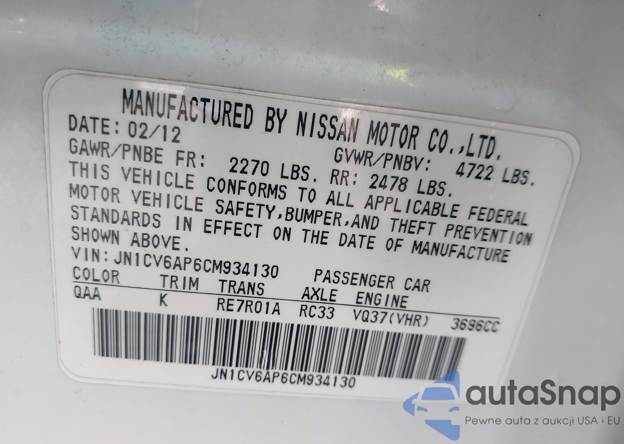 • VIN: JN1CV6AP6CM934130