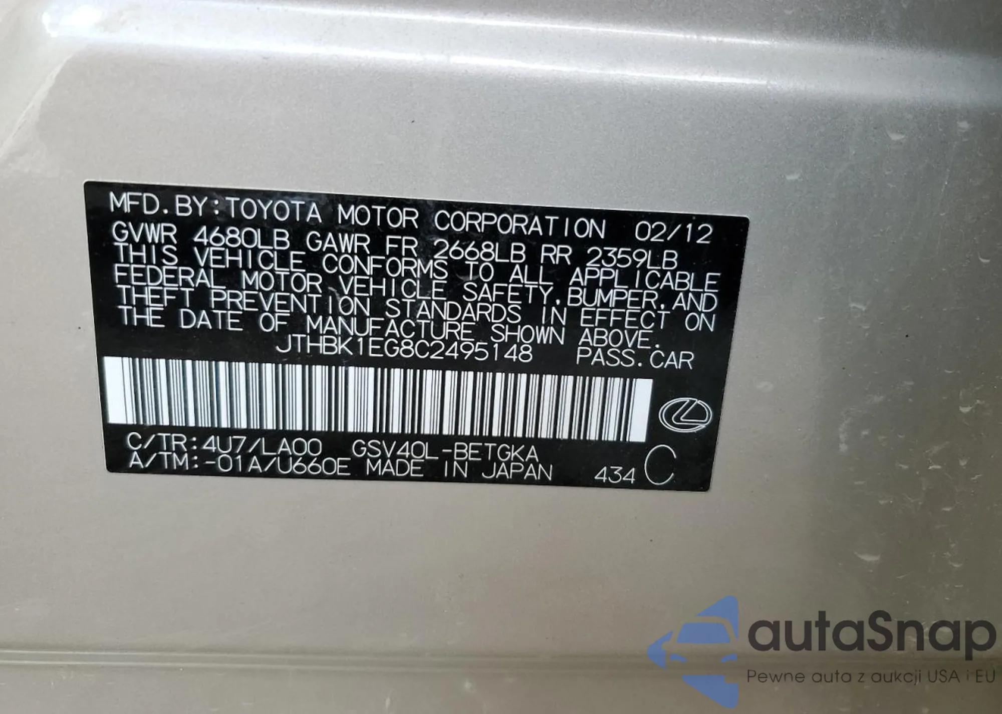 VIN: JTHBK1EG8C2495148