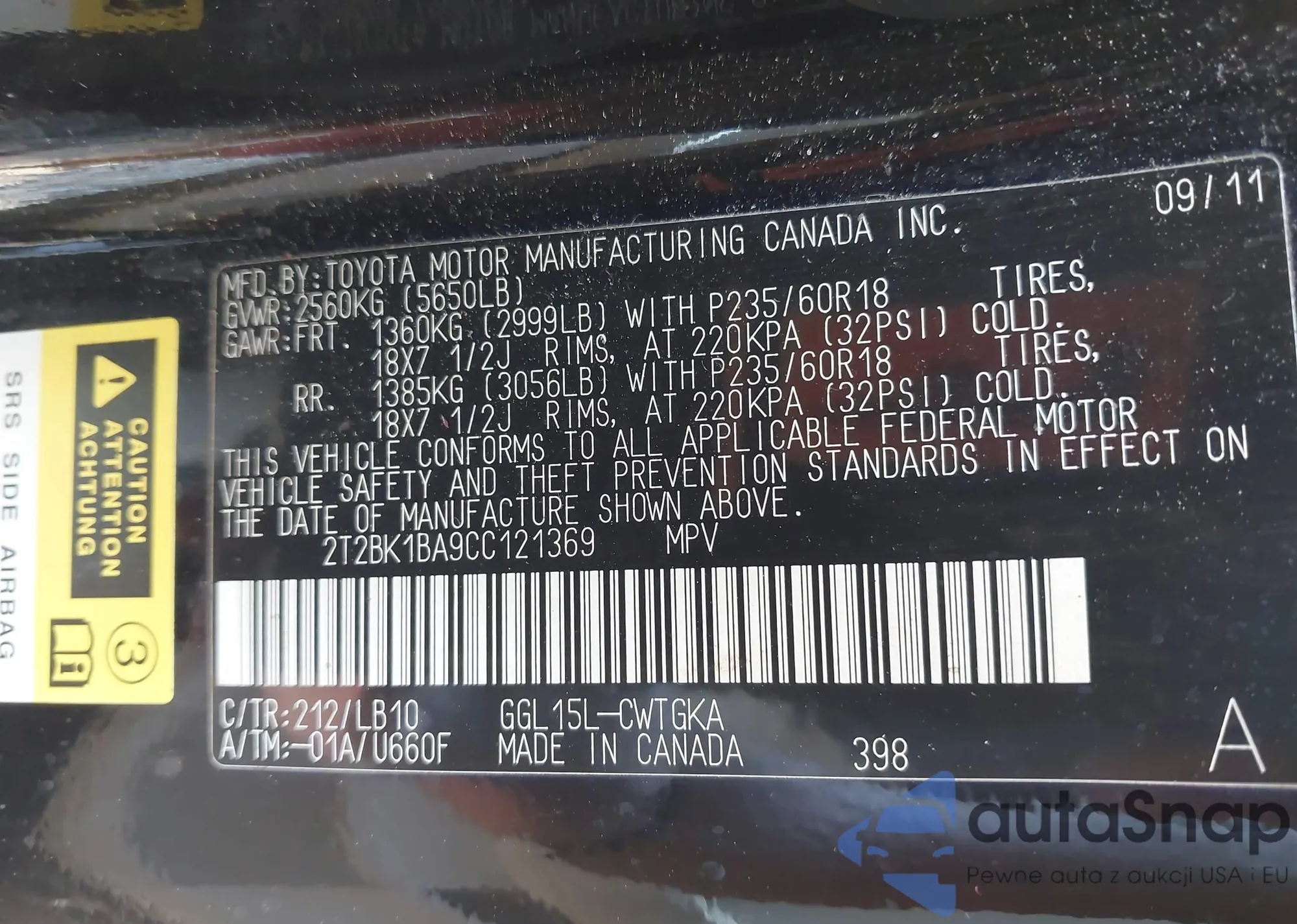 • VIN: 2T2BK1BA9CC121369
