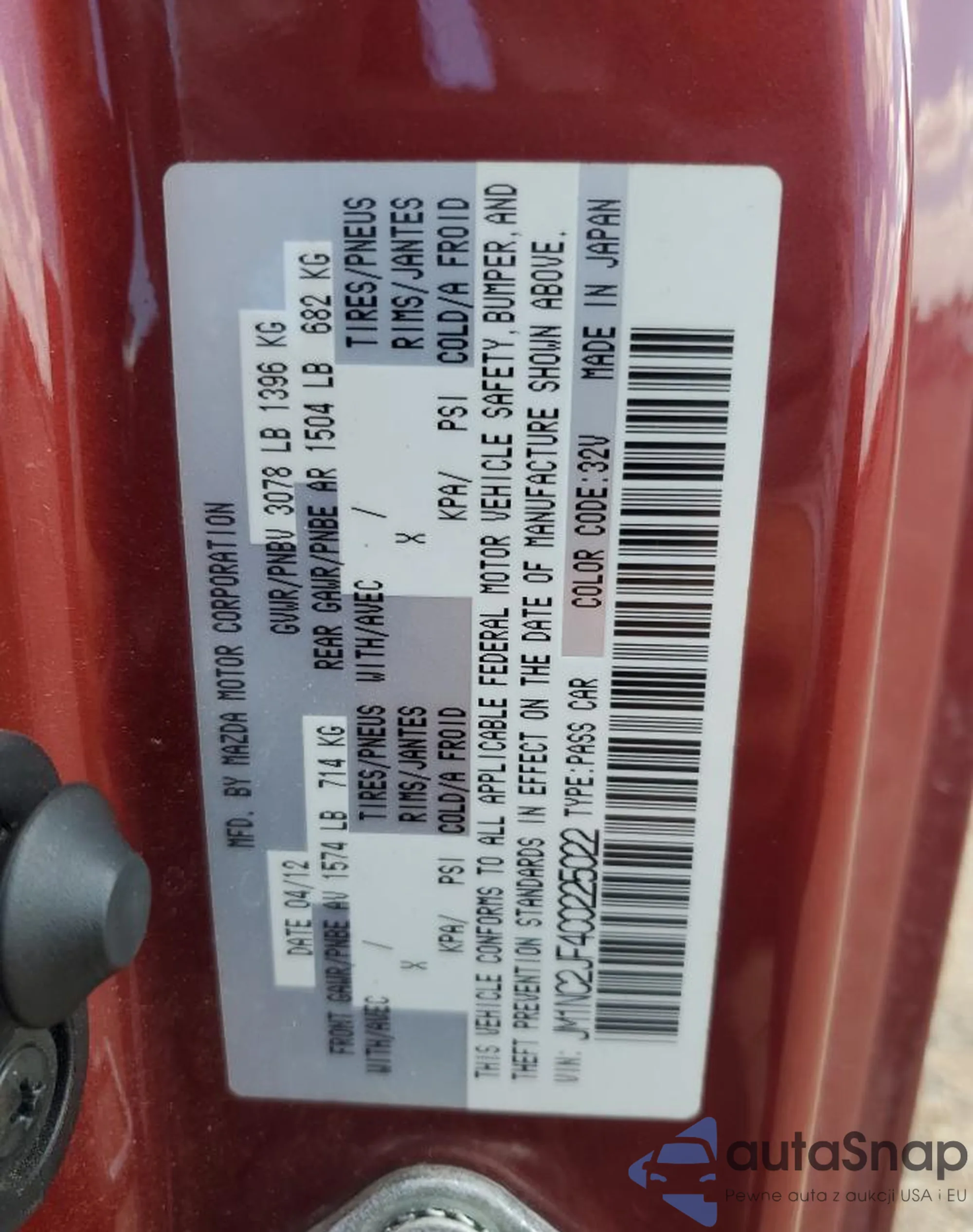 Samochód Mazda MX-5 2012 (VIN JM1NC2JF4C0225022) ma dokumenty uniemożliwiające rejestrację. Mogą pojawić się trudności przy eksporcie i rejestracji. Skontaktuj się z ekspertami AutaSnap w celu znalezienia alternatywy.