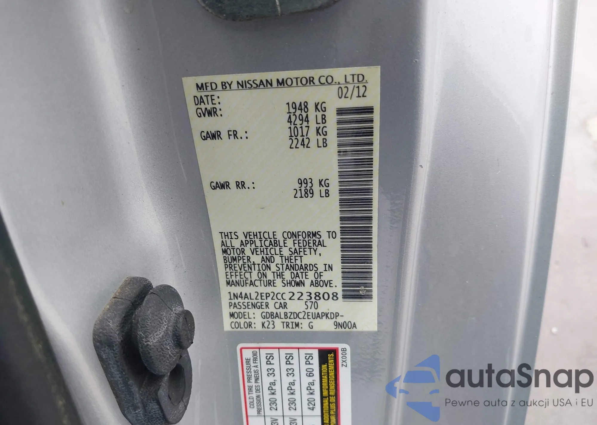 Samochód Nissan Altima 2012 (VIN 1N4AL2EP2CC223808) nie był wcześniej licytowany. Dokumenty są czyste, przebieg odpowiada lub jest niższy niż średnia rynku. Sprzedaje go firma ubezpieczeniowa – polecamy zakup. Dostawa do portu zajmie ok. 6–8 tygodni.