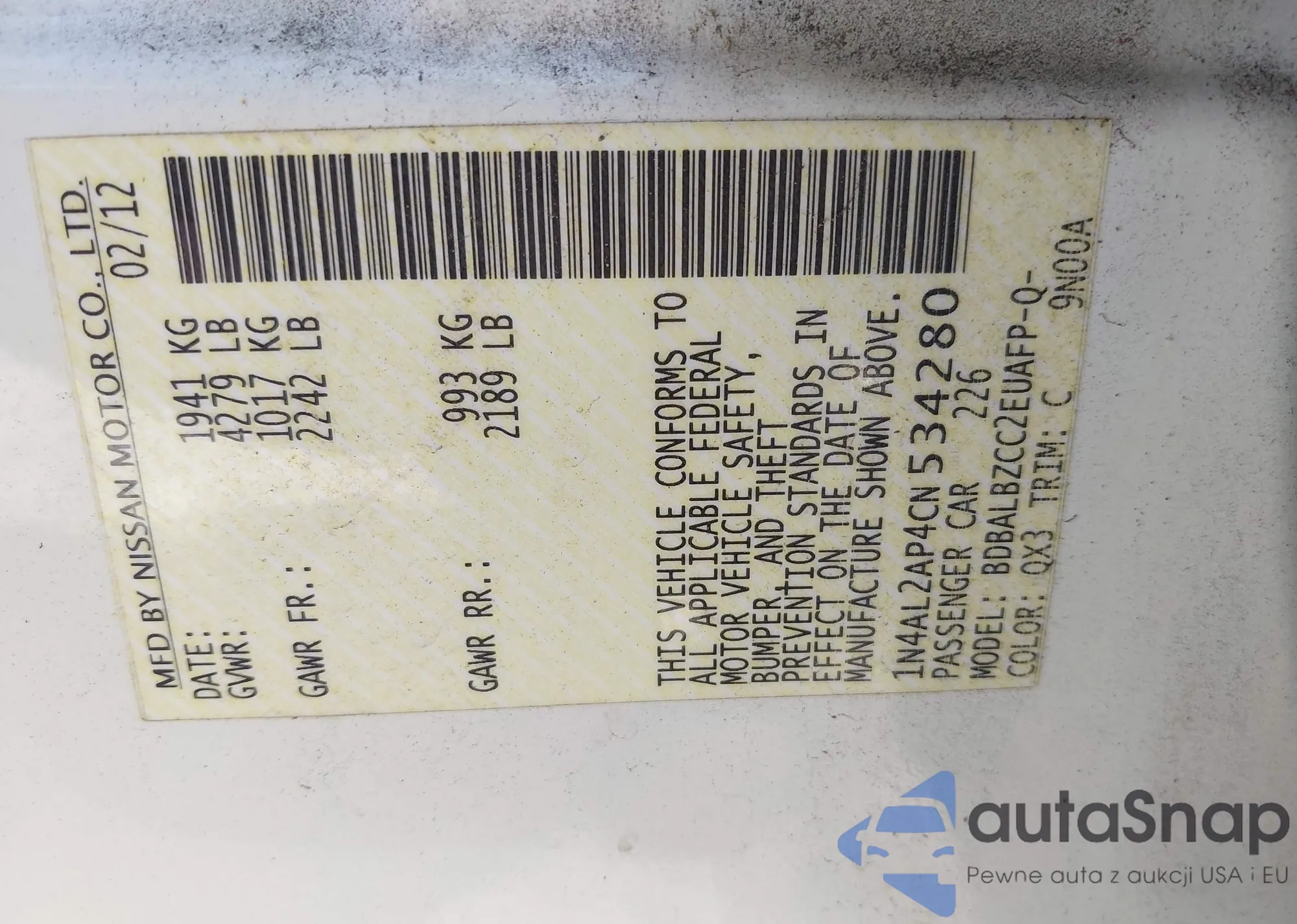 VIN: 1N4AL2AP4CN534280