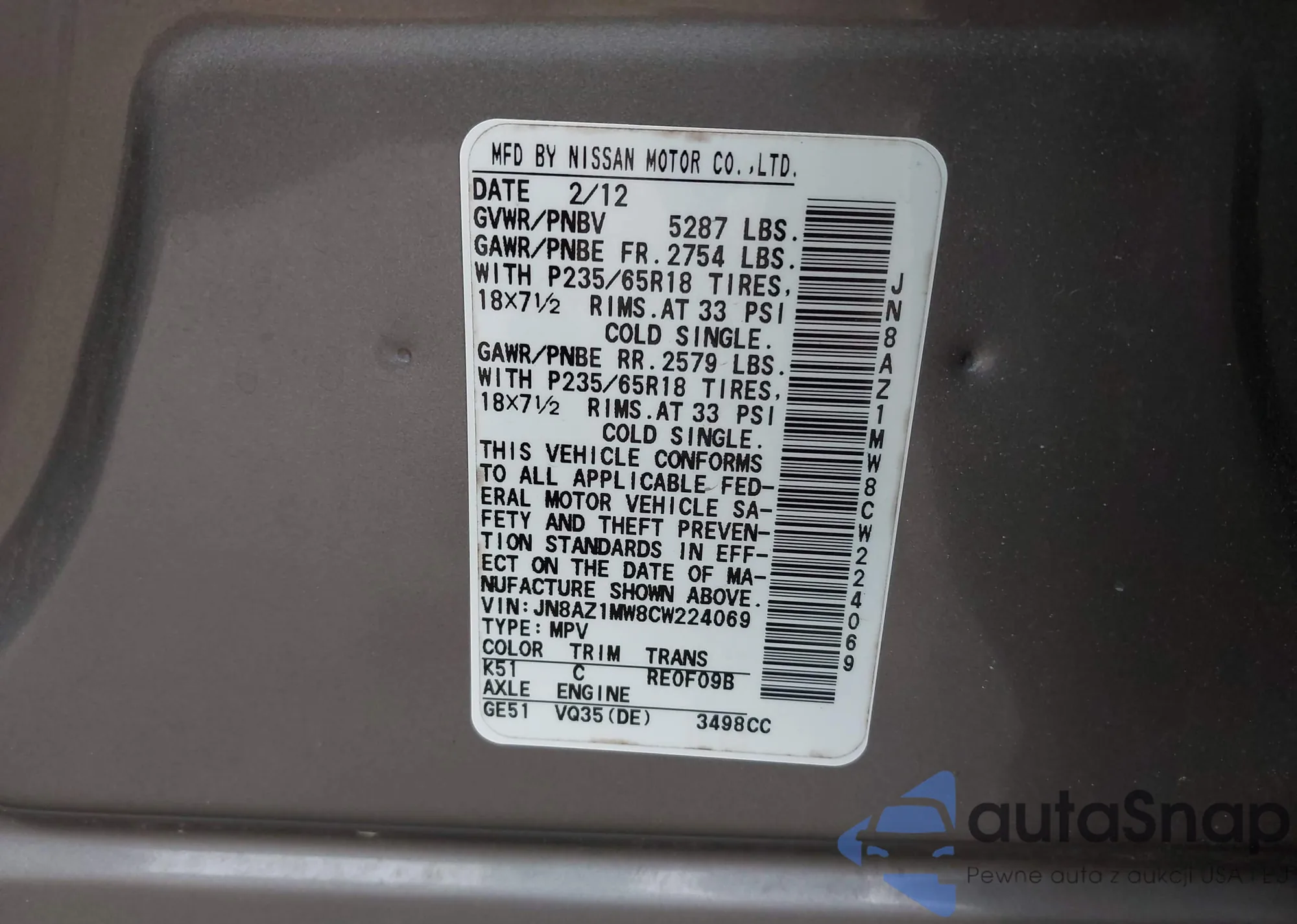VIN: JN8AZ1MW8CW224069