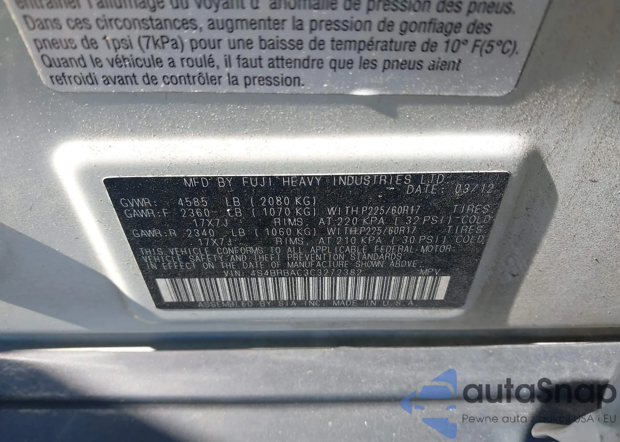 • VIN: 4S4BRBAC3C3272382