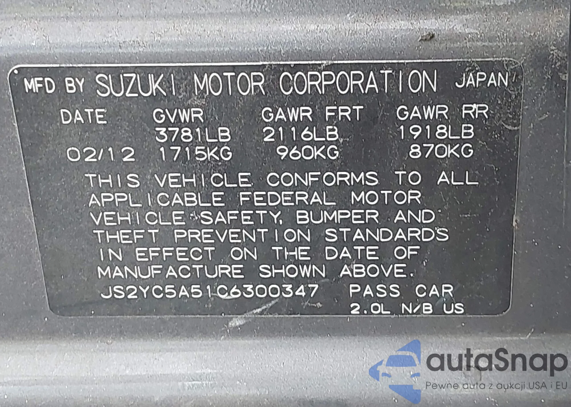 VIN: JS2YC5A51C6300347