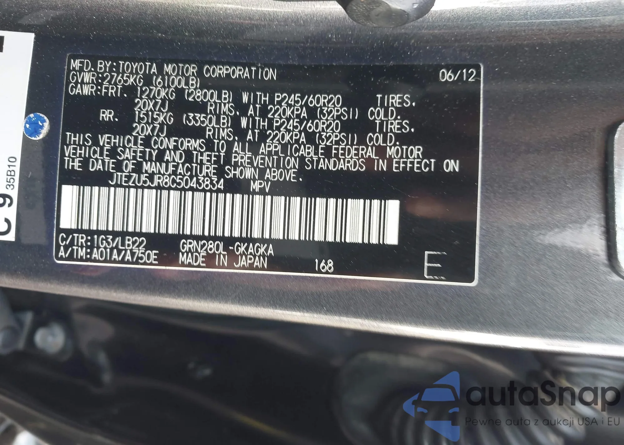 Samochód Toyota 4Runner 2012 (VIN JTEZU5JR8C5043834) nie był wcześniej licytowany. Dokumenty są czyste, przebieg odpowiada lub jest niższy niż średnia rynku. Sprzedaje go firma ubezpieczeniowa – polecamy zakup. Dostawa do portu zajmie ok. 6–8 tygodni.