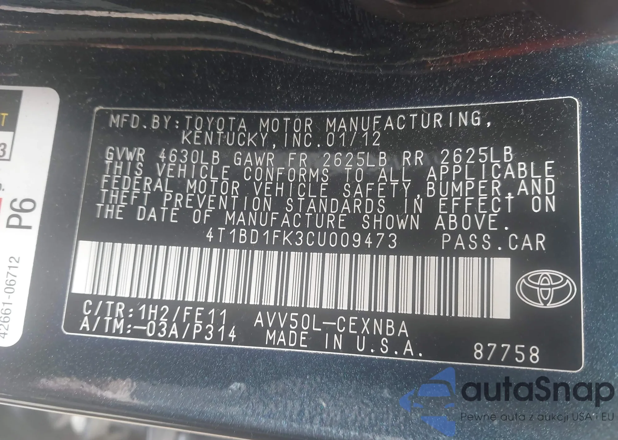 VIN: 4T1BD1FK3CU009473