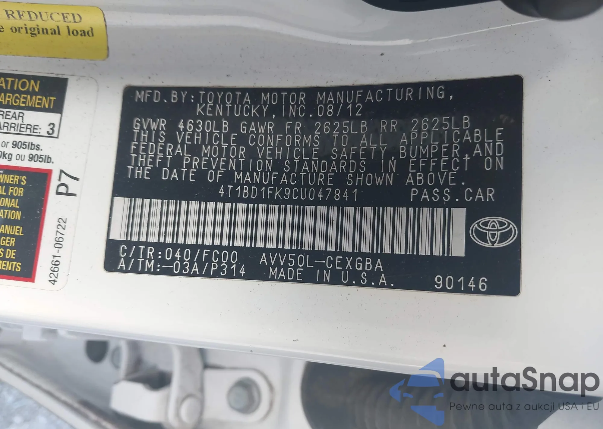 VIN: 4T1BD1FK9CU047841
