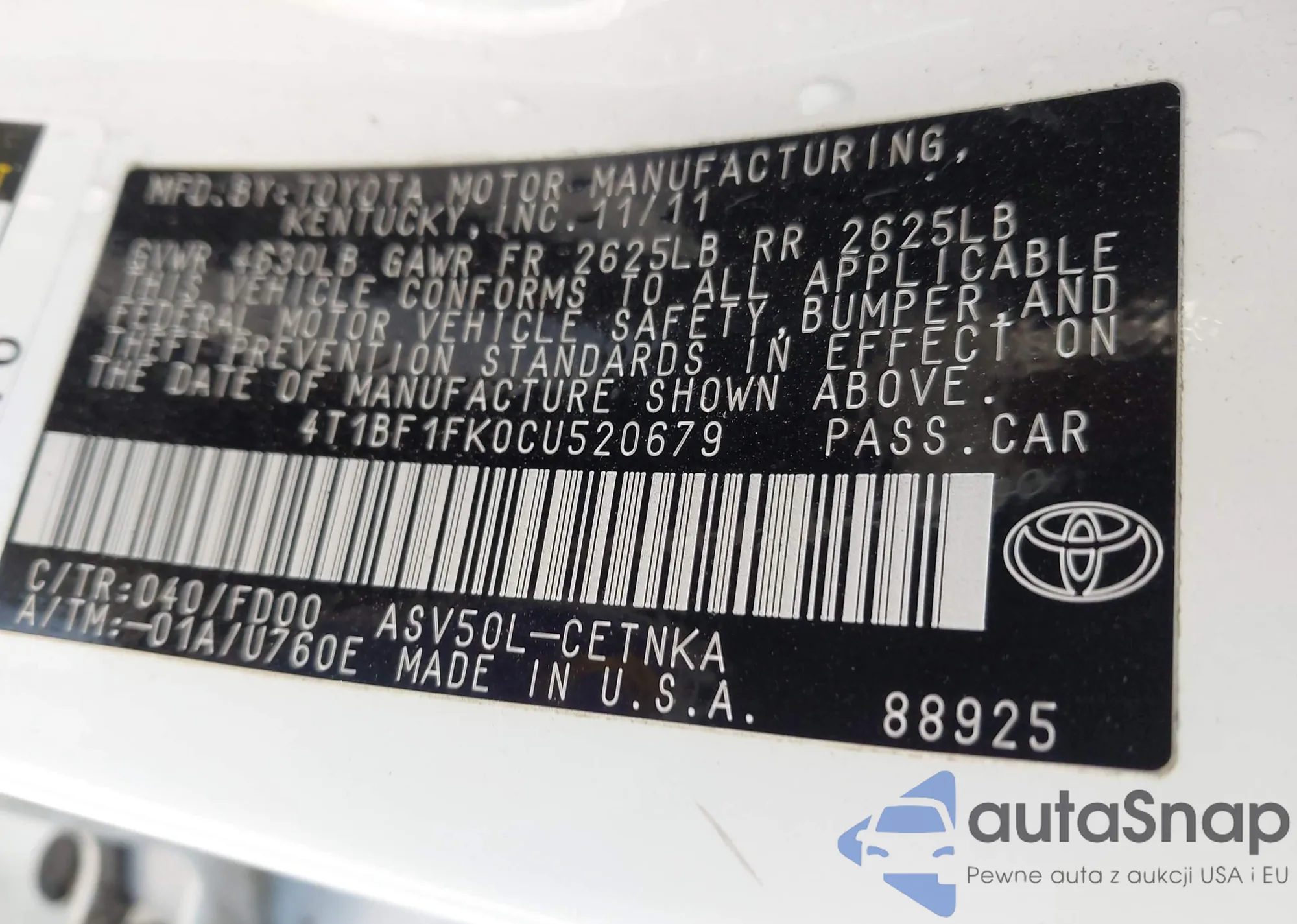 VIN: 4T1BF1FK0CU520679