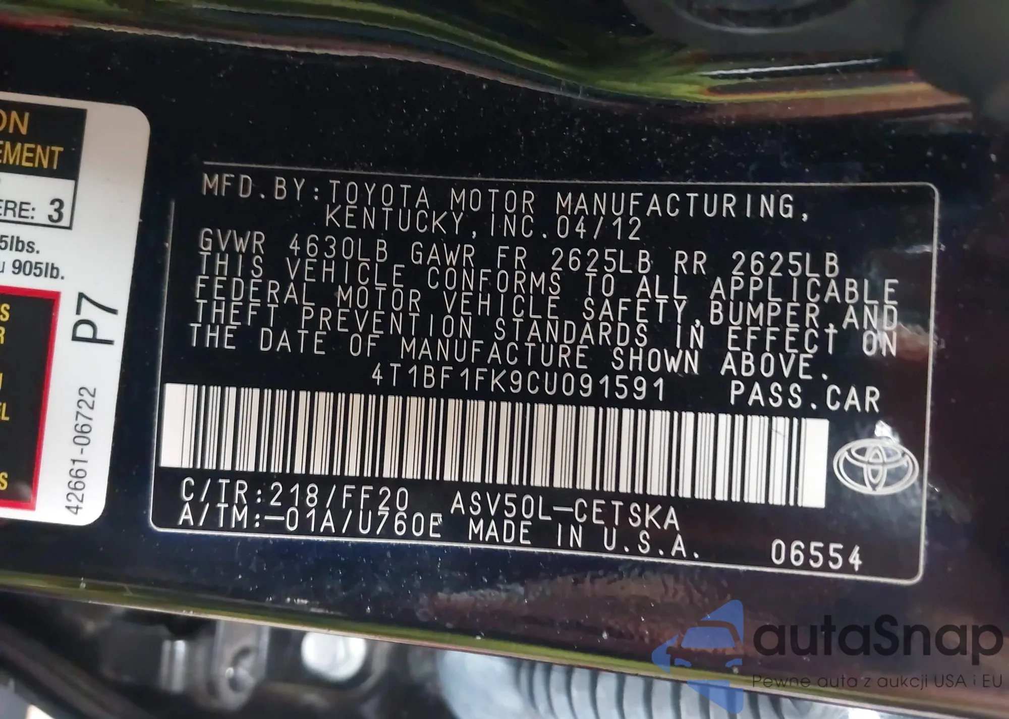 VIN: 4T1BF1FK9CU091591