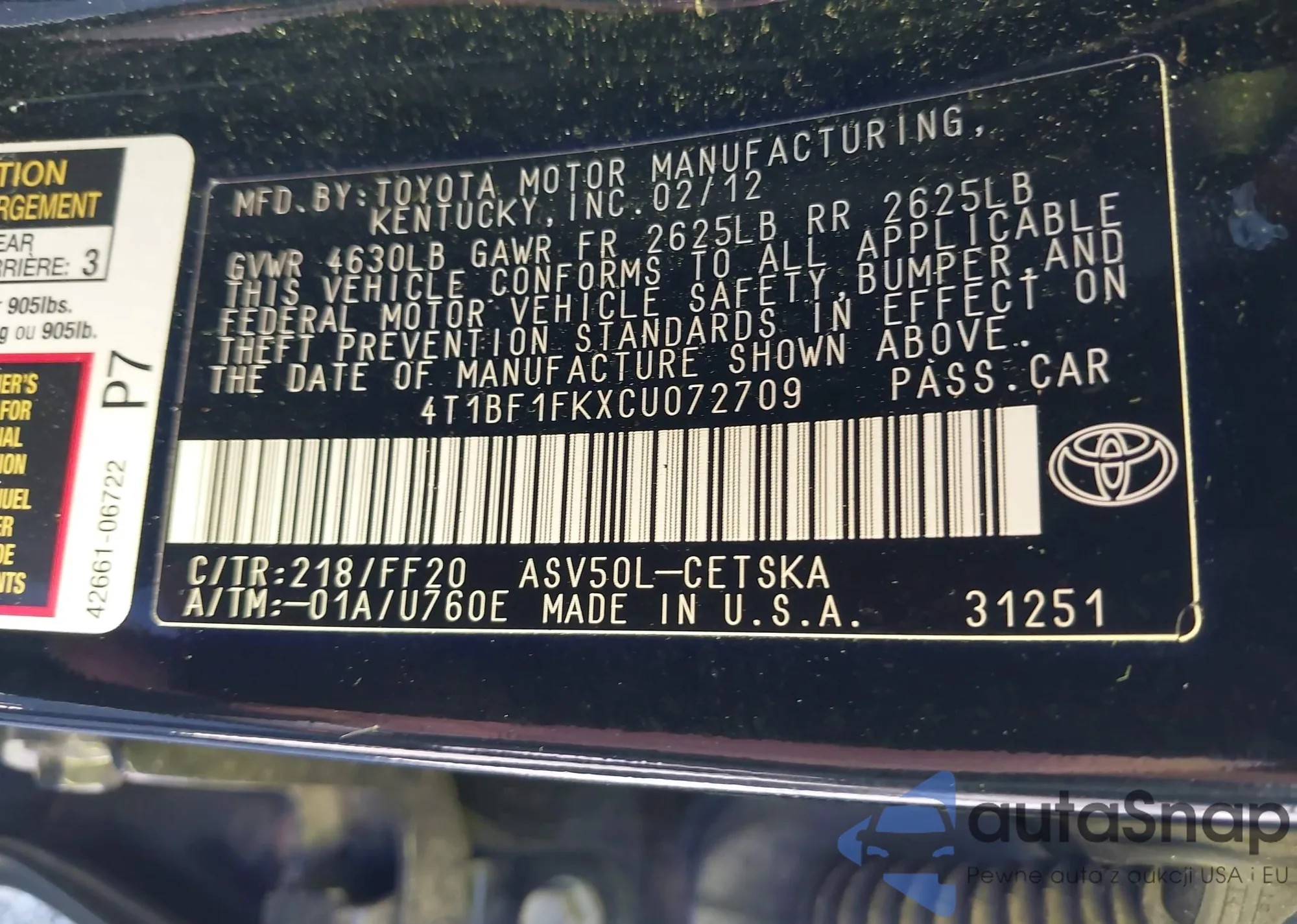 VIN: 4T1BF1FKXCU072709