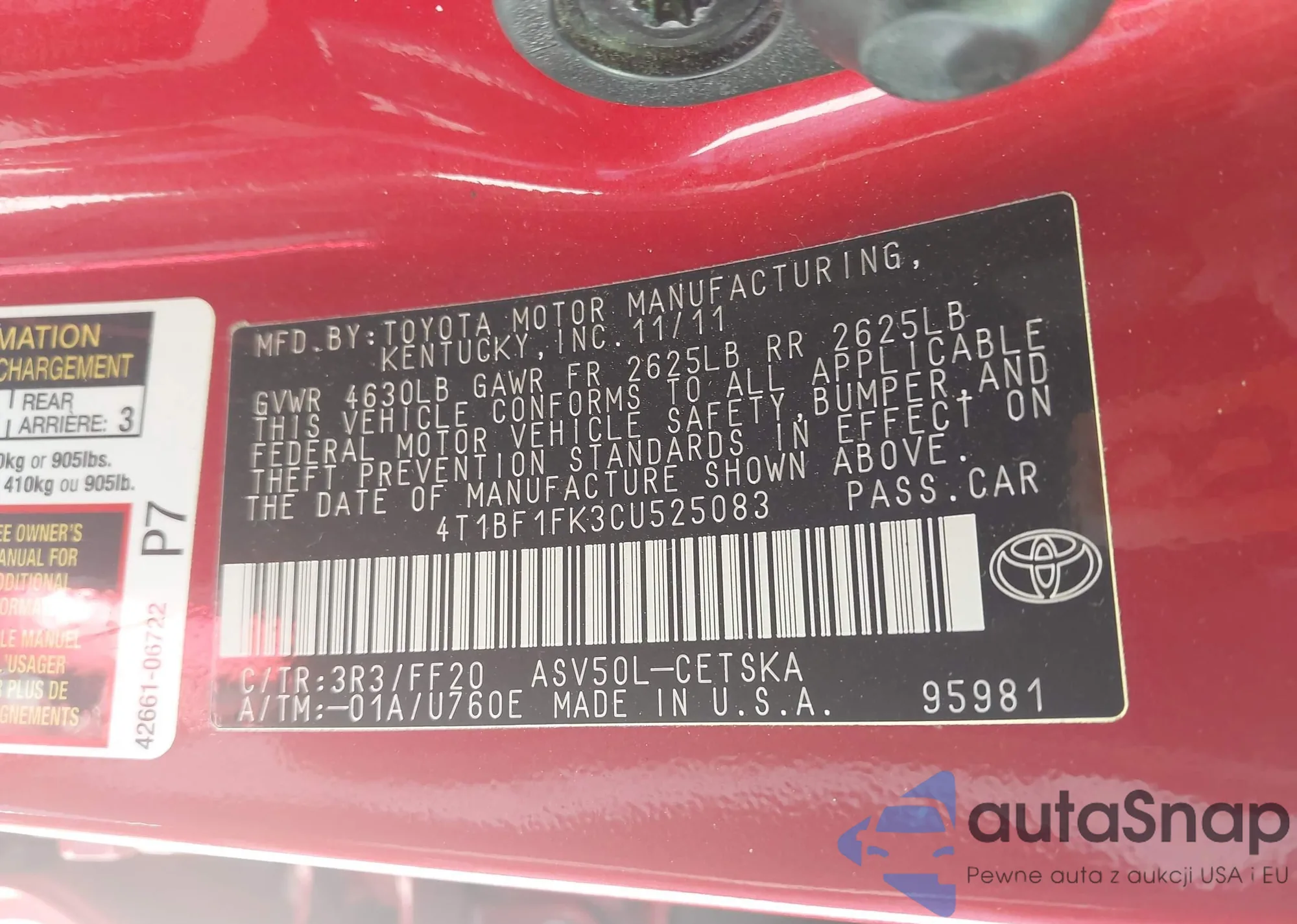 VIN: 4T1BF1FK3CU525083