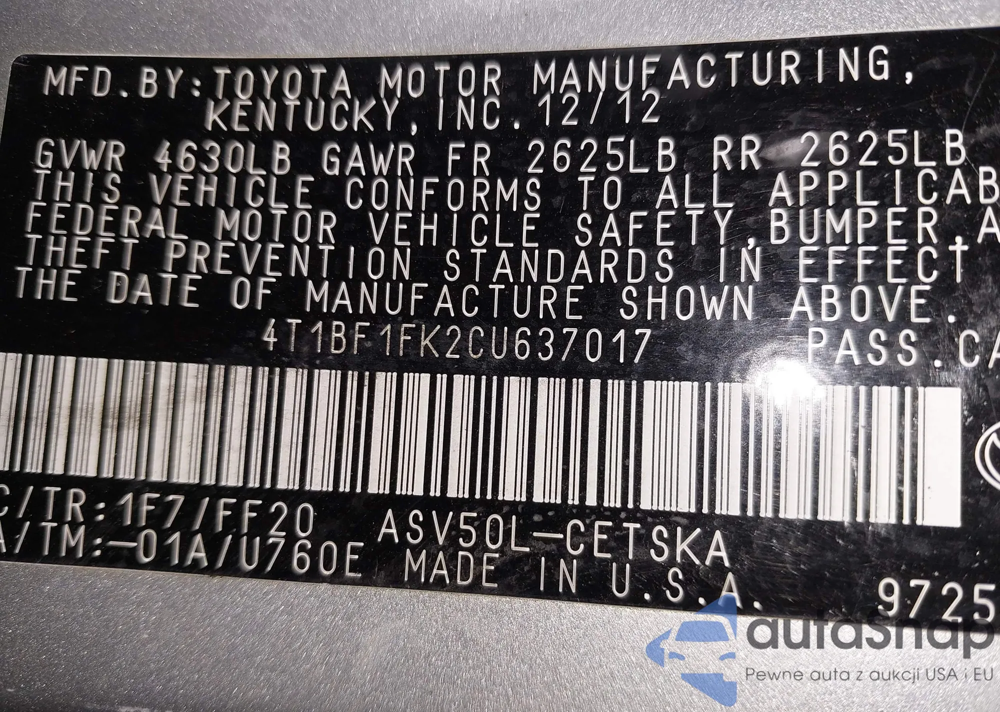 Samochód Toyota Camry 2012 (VIN 4T1BF1FK2CU637017) nie był wcześniej licytowany. Dokumenty są czyste, przebieg odpowiada lub jest niższy niż średnia rynku. Sprzedaje go firma ubezpieczeniowa – polecamy zakup. Dostawa do portu zajmie ok. 6–8 tygodni.