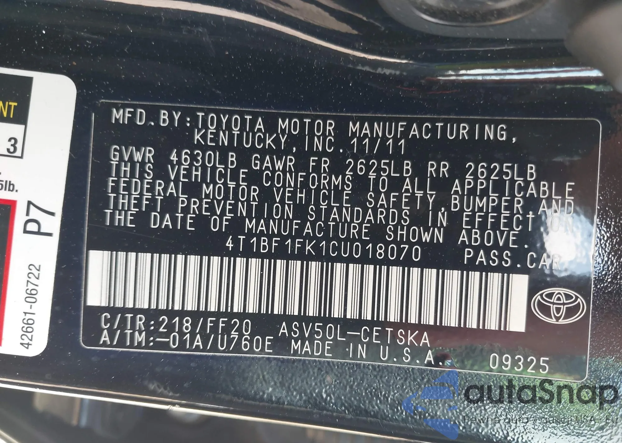 VIN: 4T1BF1FK1CU018070