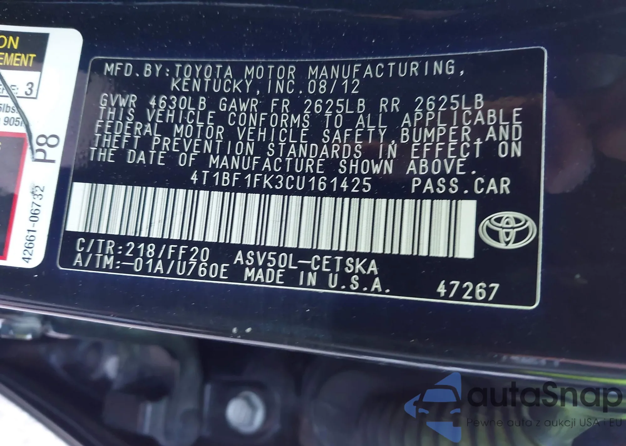 • VIN: 4T1BF1FK3CU161425