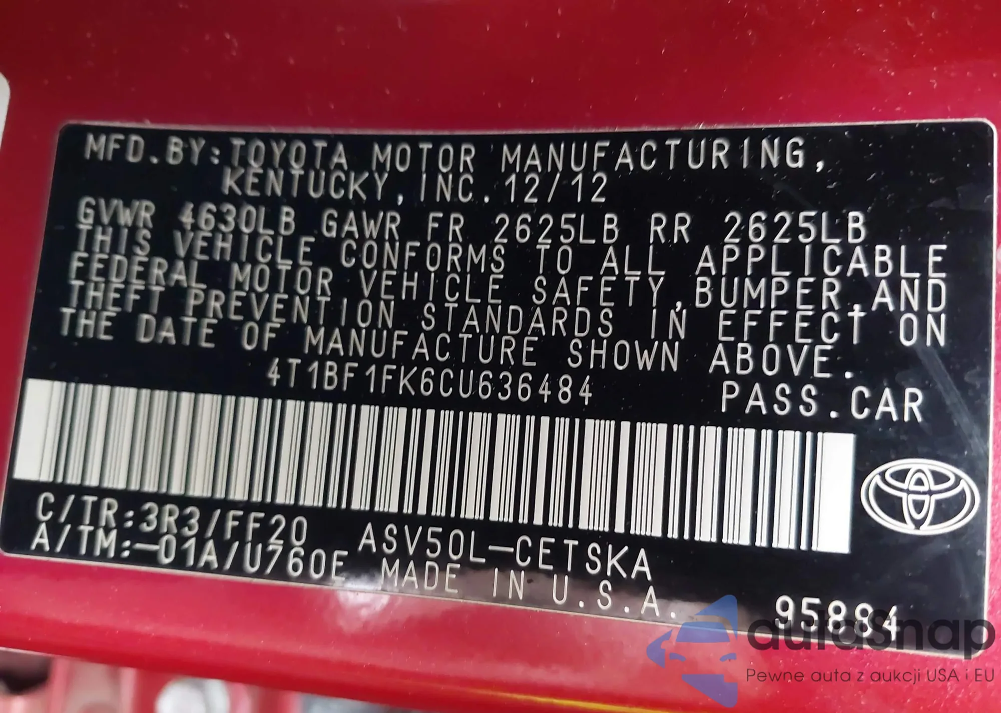 VIN: 4T1BF1FK6CU636484