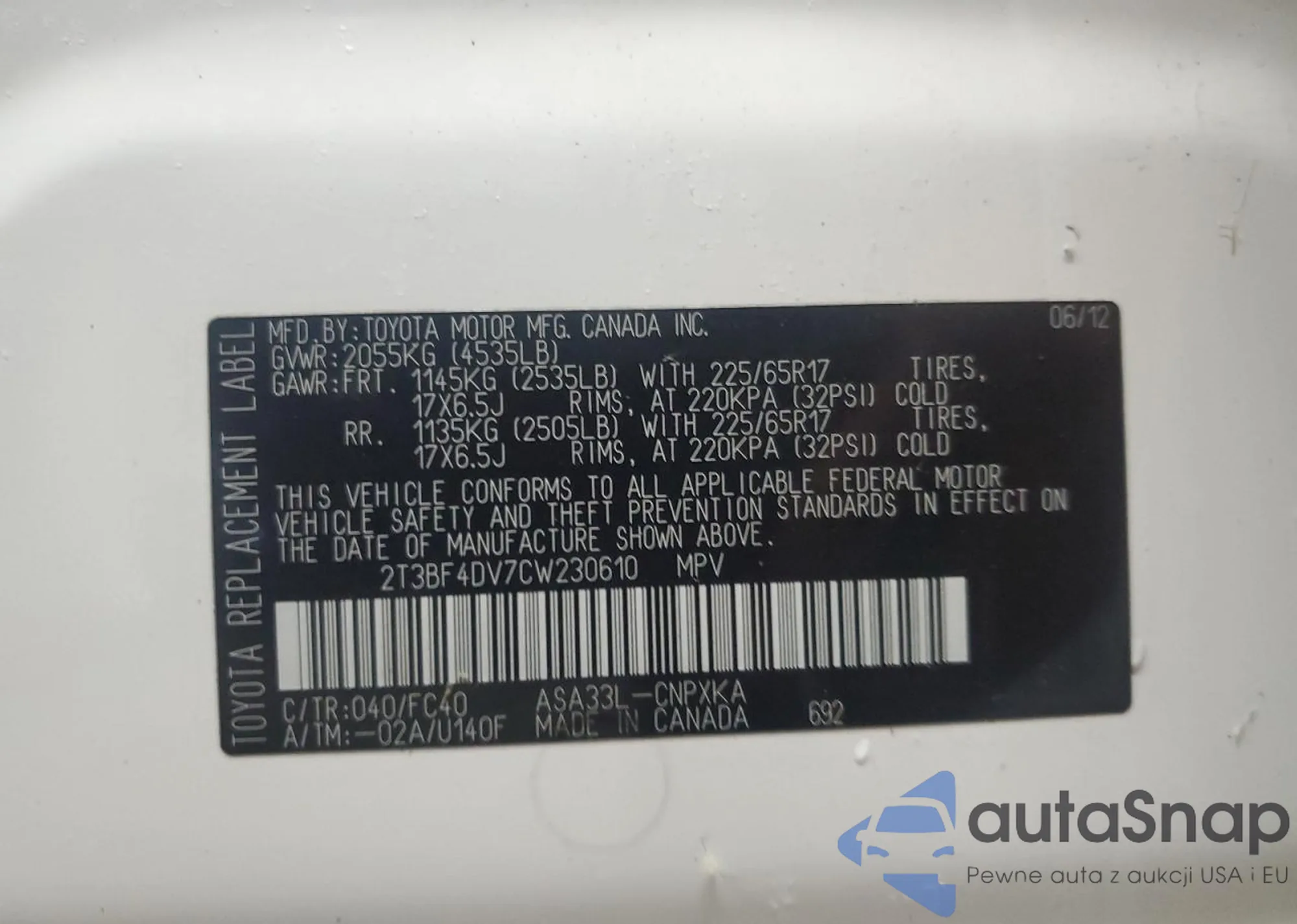 VIN: 2T3BF4DV7CW230610