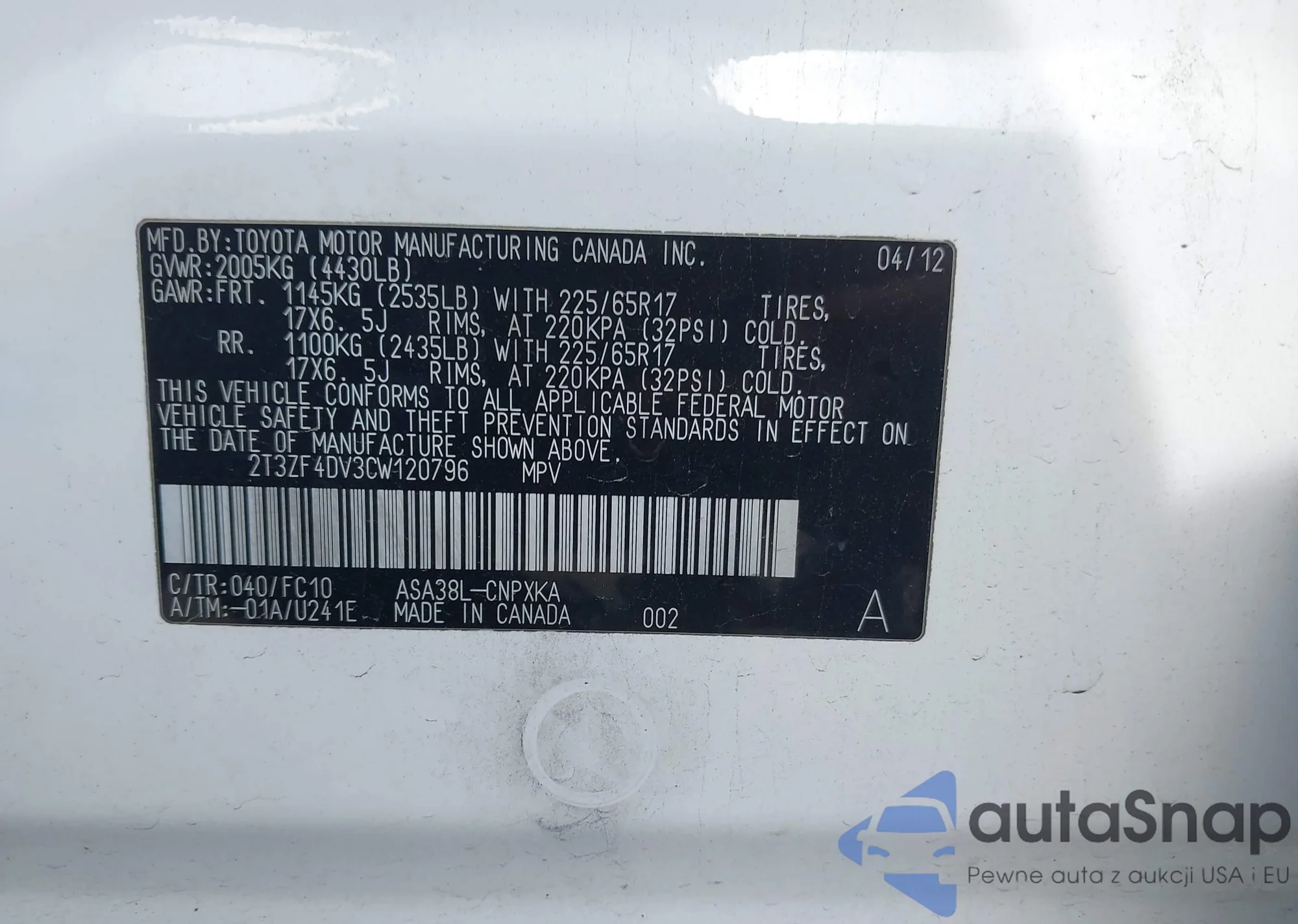 VIN: 2T3ZF4DV3CW120796