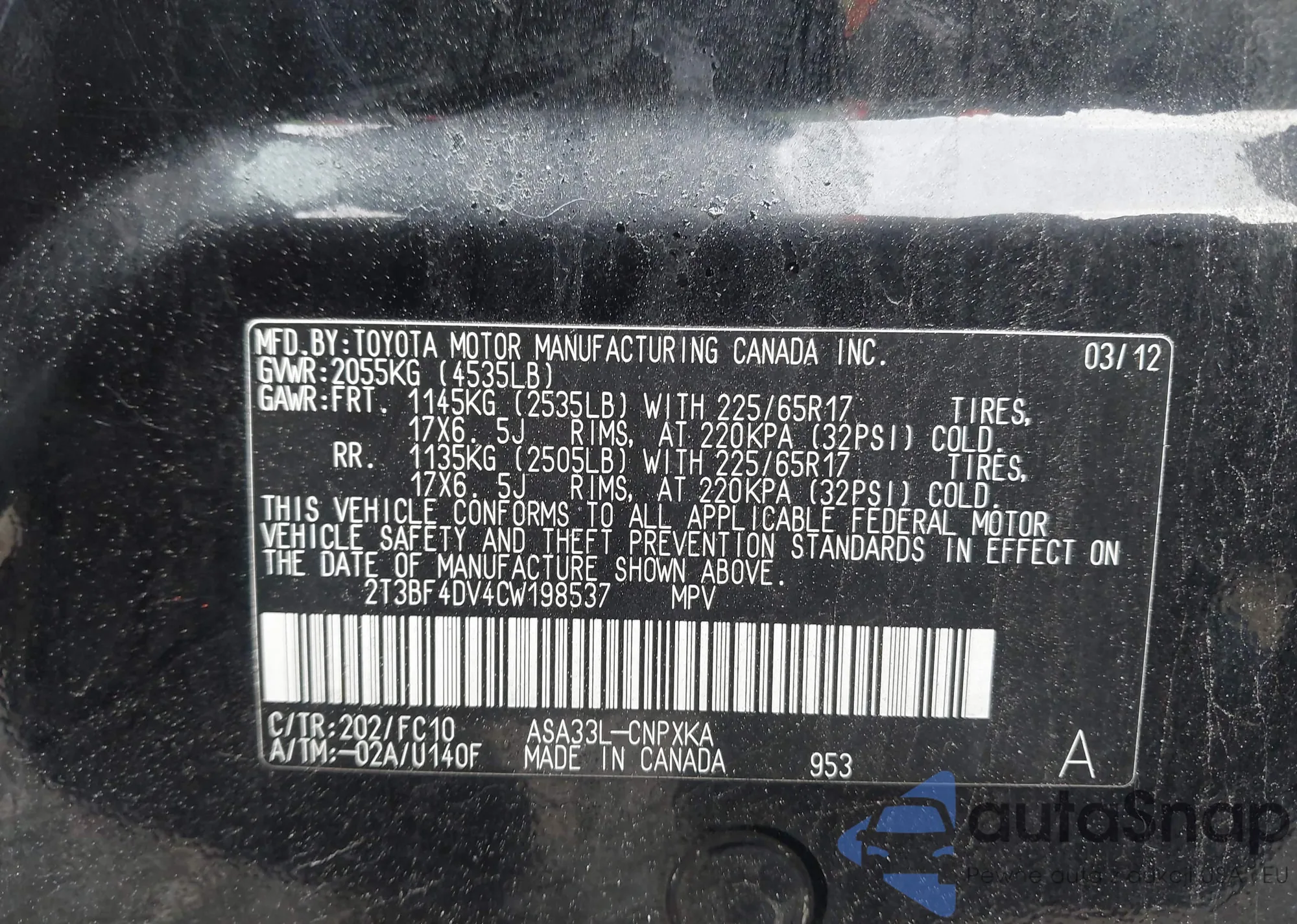 VIN: 2T3BF4DV4CW198537