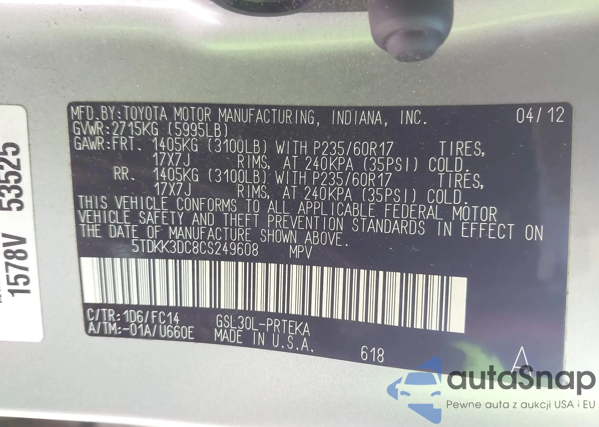 Samochód Toyota Sienna 2012 (VIN 5TDKK3DC8CS249608) nie był wcześniej licytowany. Dokumenty są czyste, przebieg odpowiada lub jest niższy niż średnia rynku. Sprzedaje go firma ubezpieczeniowa – polecamy zakup. Dostawa do portu zajmie ok. 6–8 tygodni.