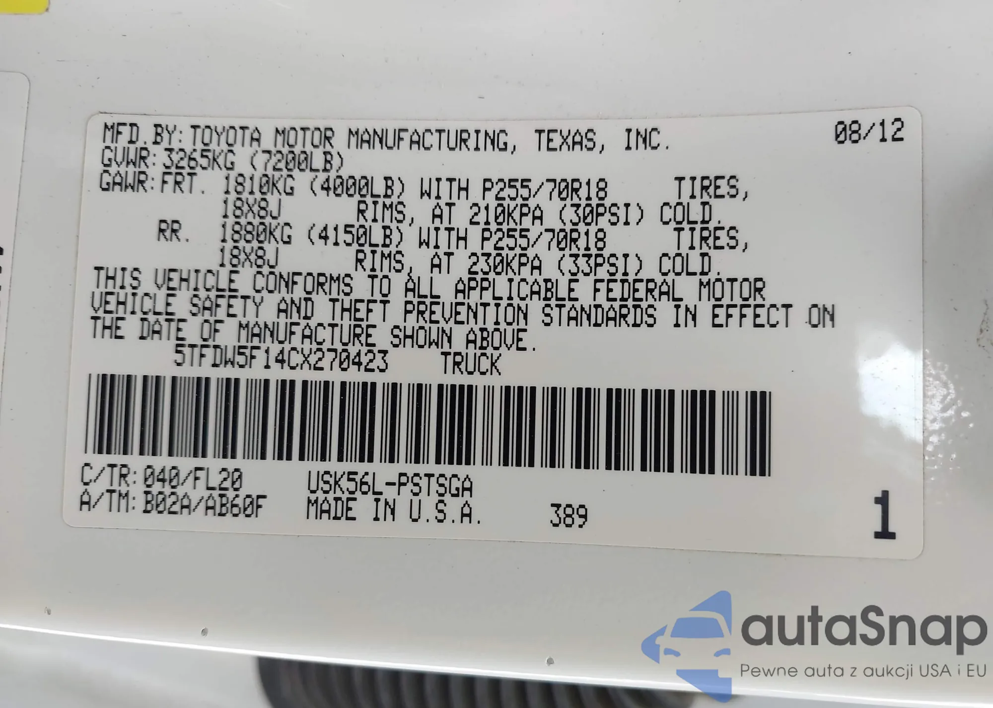 VIN: 5TFDW5F14CX270423