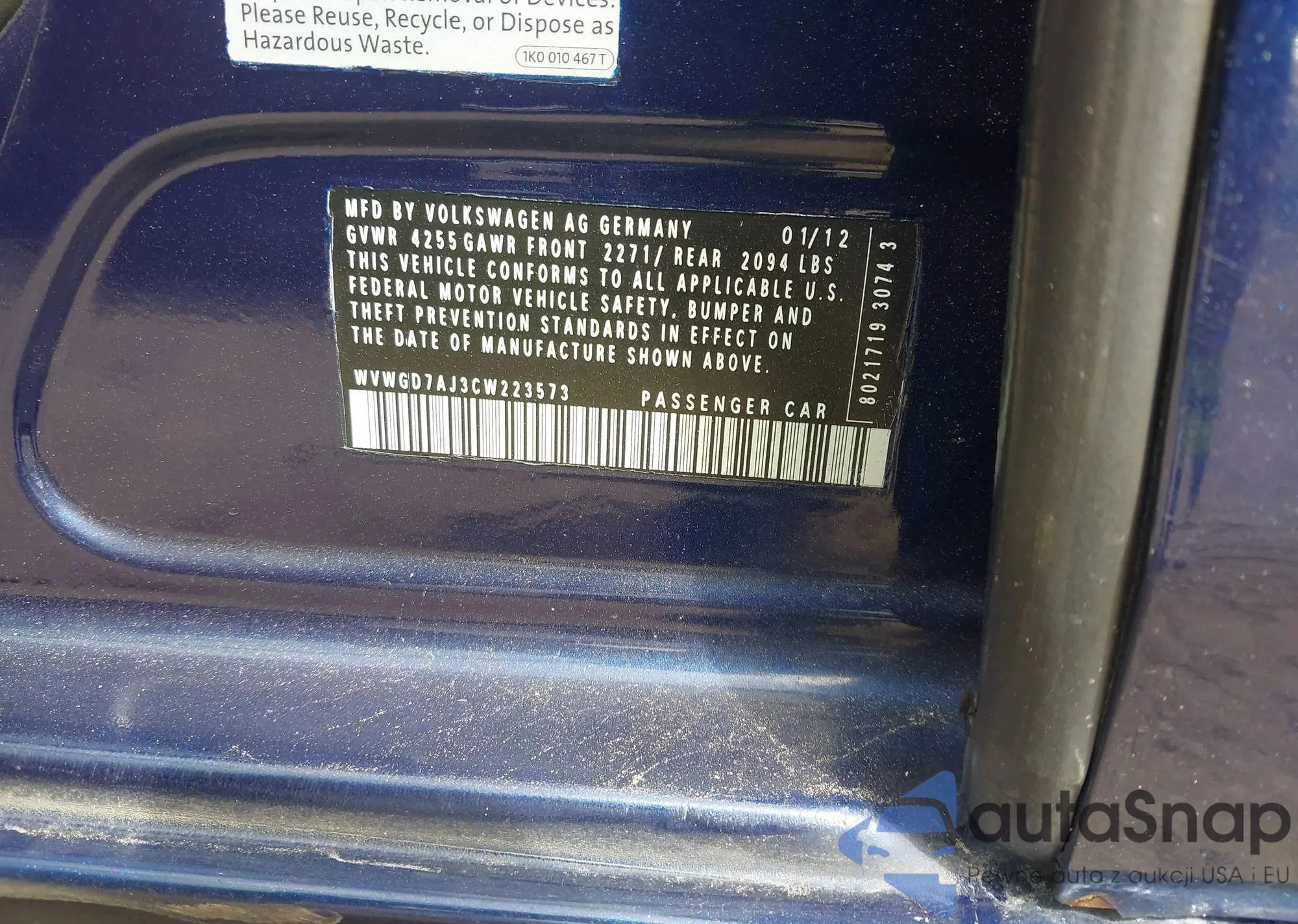 VIN: WVWGD7AJ3CW223573