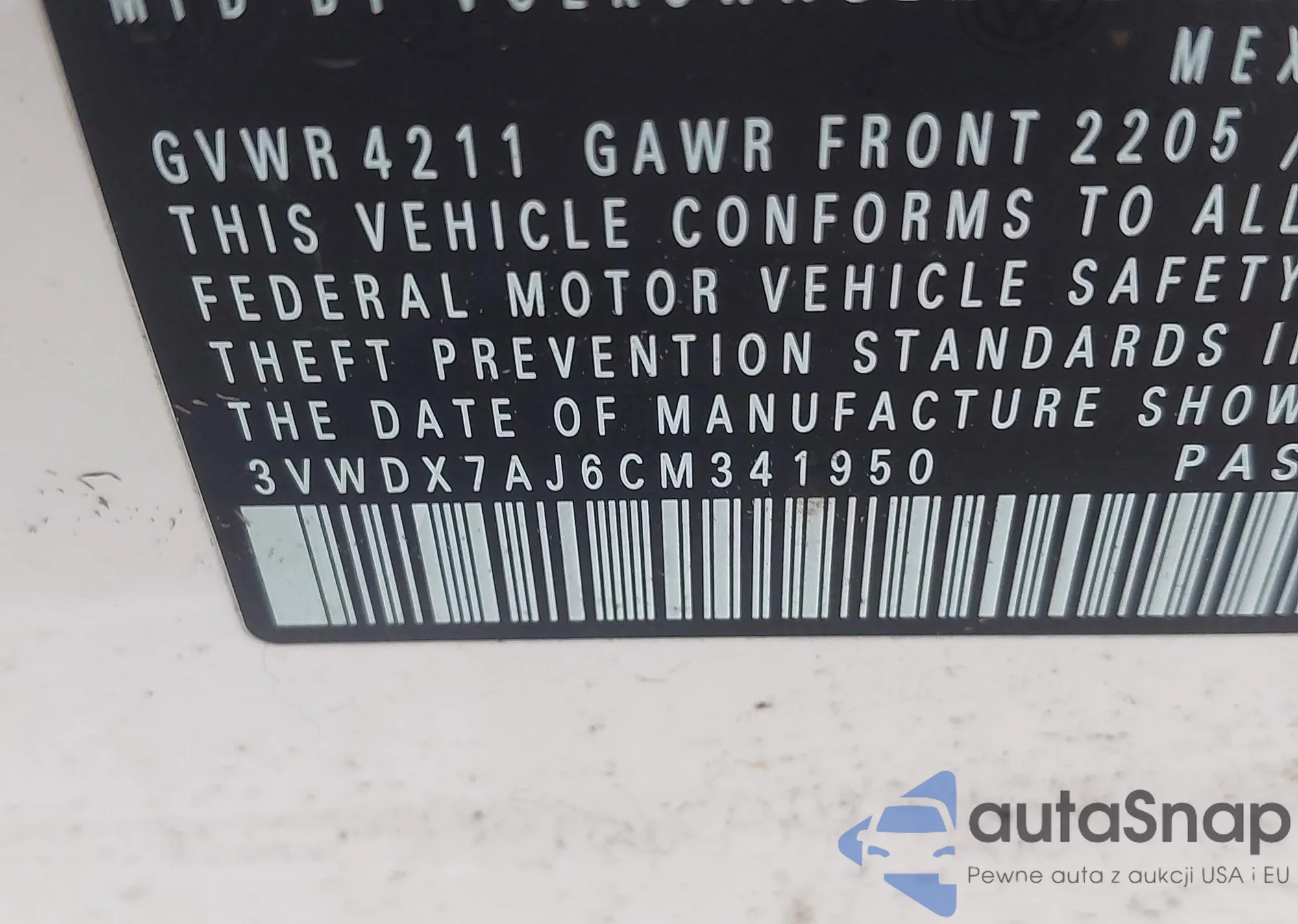 VIN: 3VWDX7AJ6CM341950