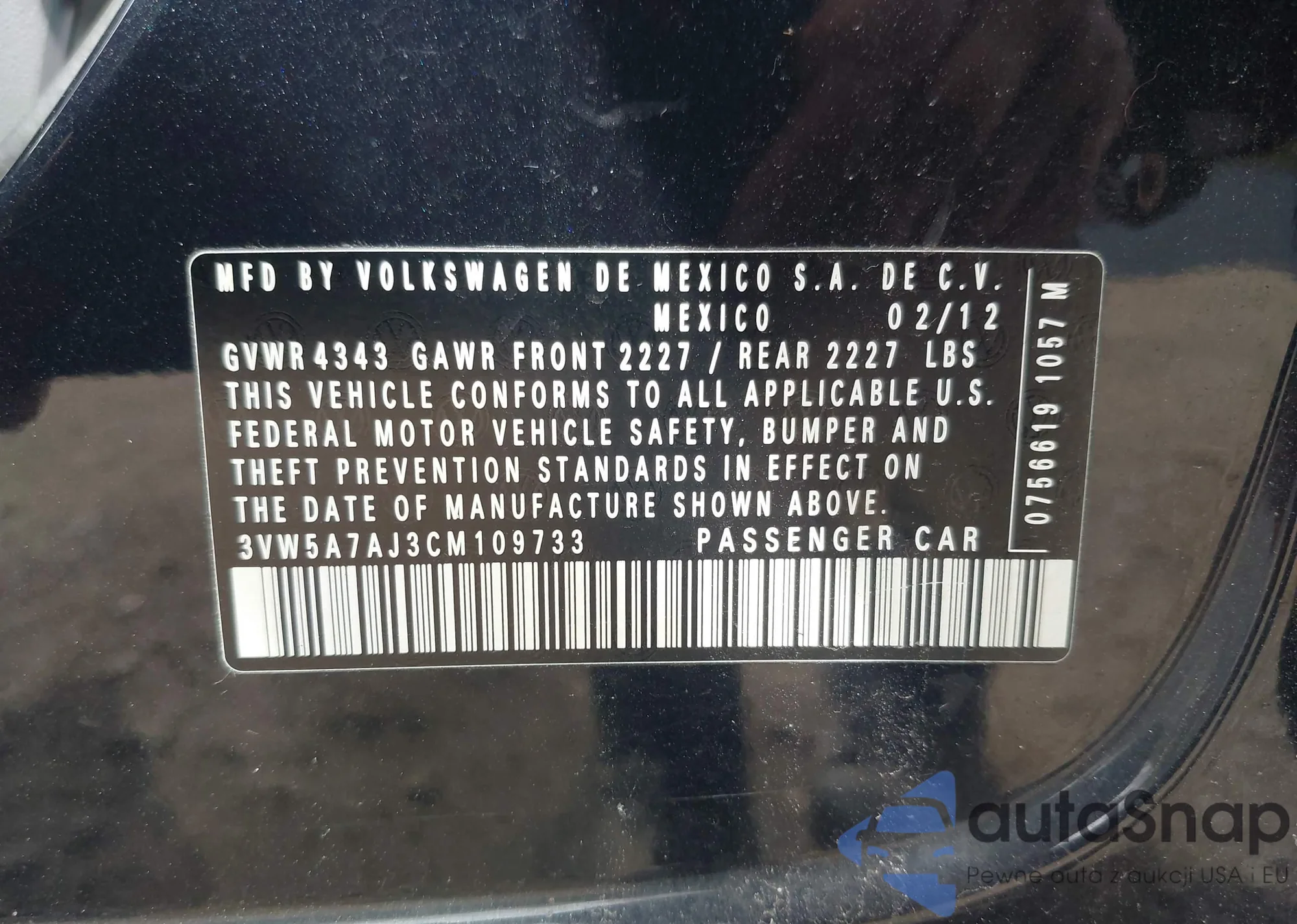 VIN: 3VW5A7AJ3CM109733
