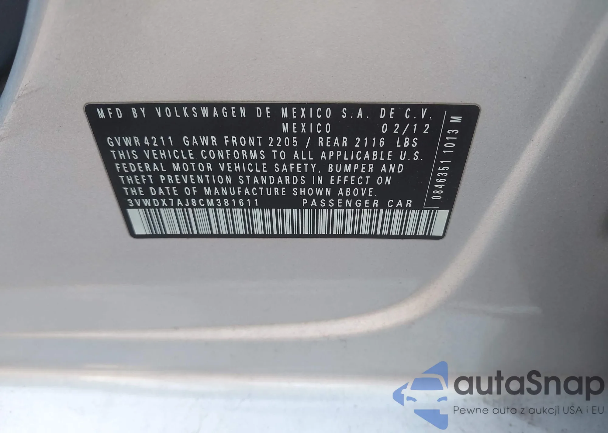 VIN: 3VWDX7AJ8CM381611