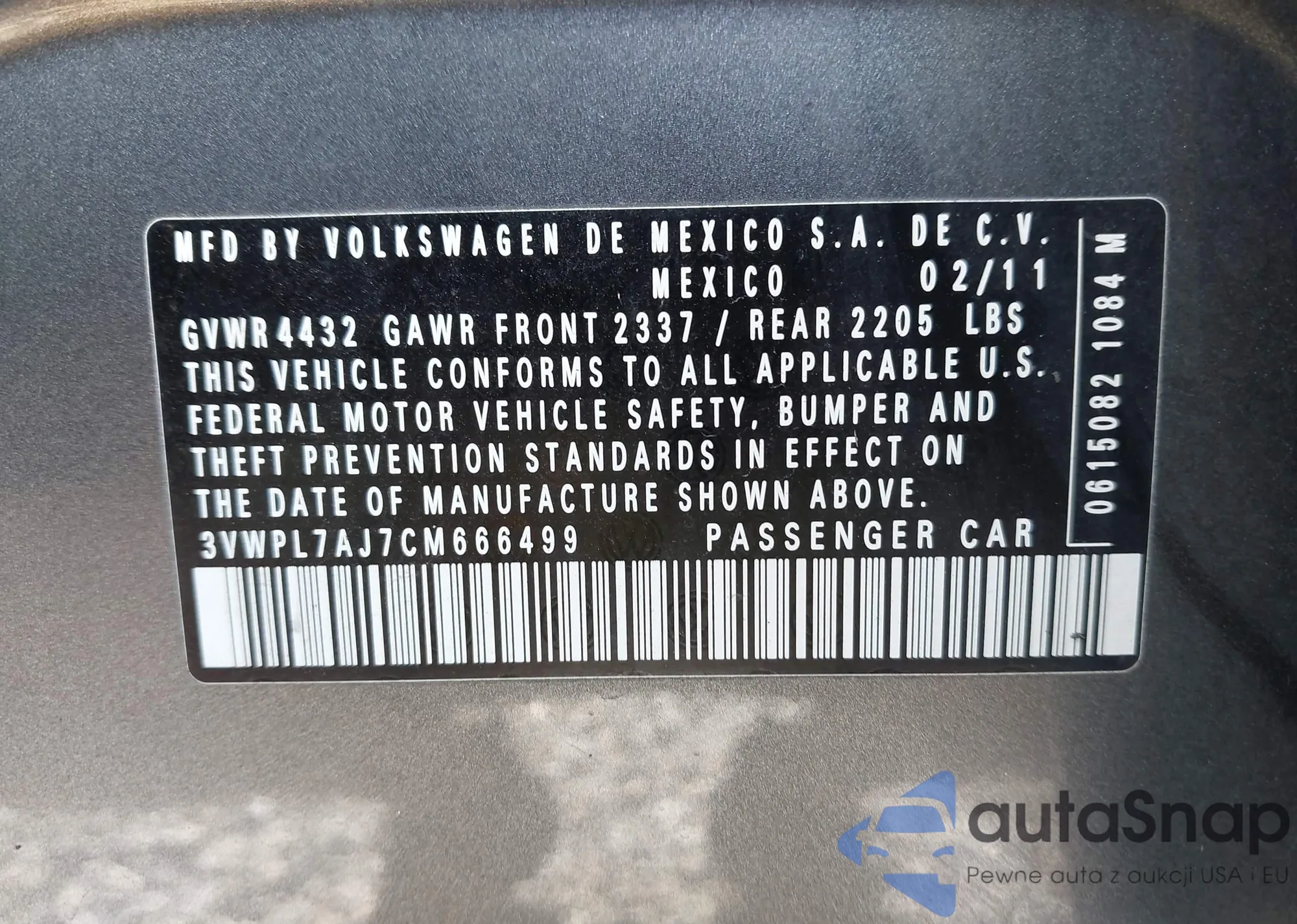 VIN: 3VWPL7AJ7CM666499