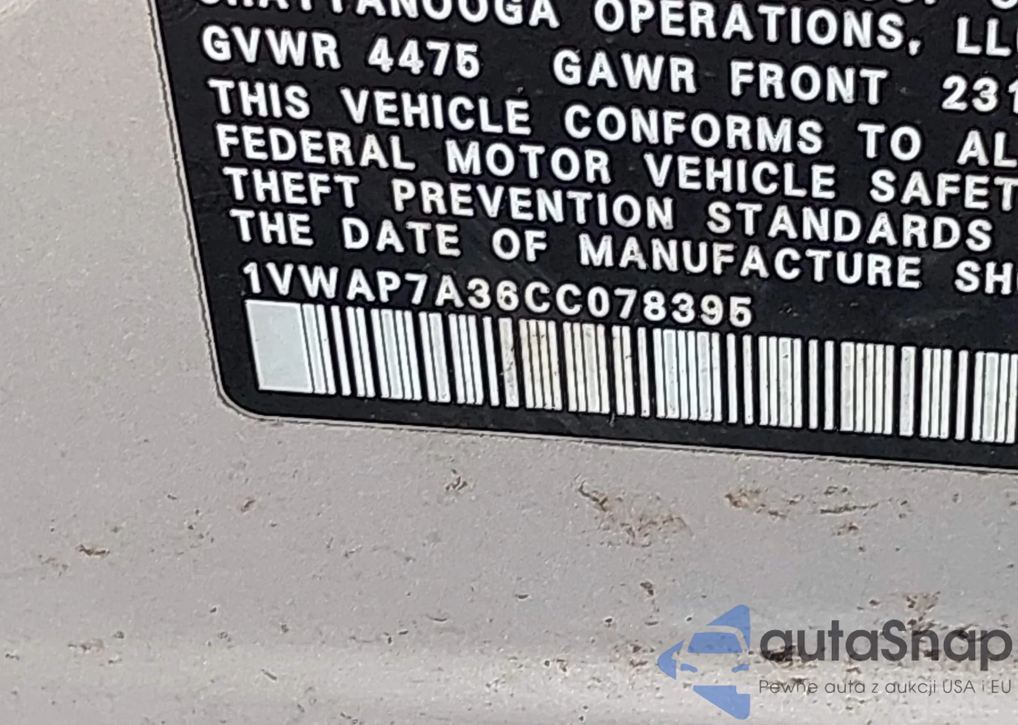 Samochód Volkswagen Passat 2012 (VIN 1VWAP7A36CC078395) nie był wcześniej licytowany. Dokumenty są czyste, przebieg odpowiada lub jest niższy niż średnia rynku. Sprzedaje go firma ubezpieczeniowa – polecamy zakup. Dostawa do portu zajmie ok. 6–8 tygodni.