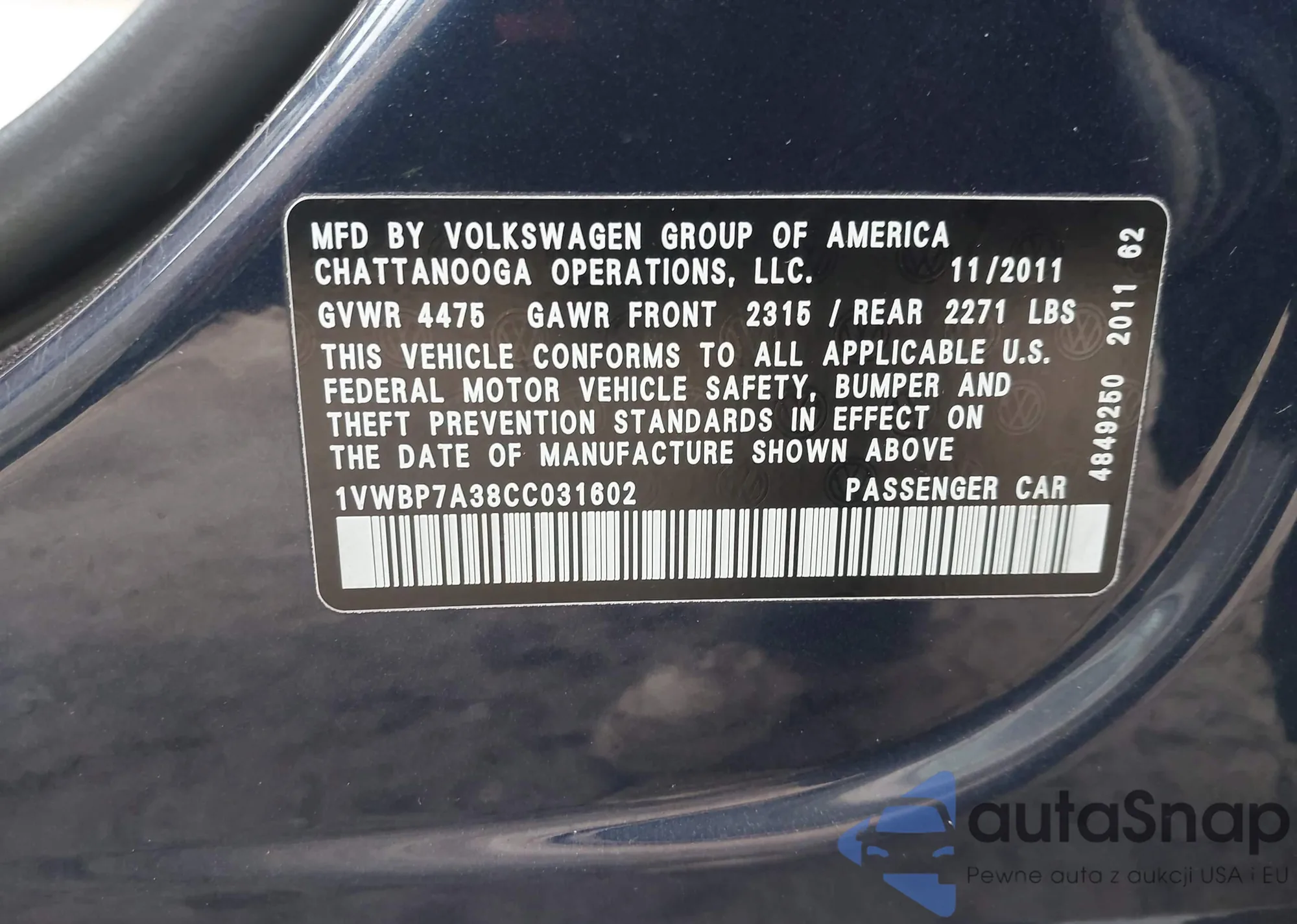 VIN: 1VWBP7A38CC031602