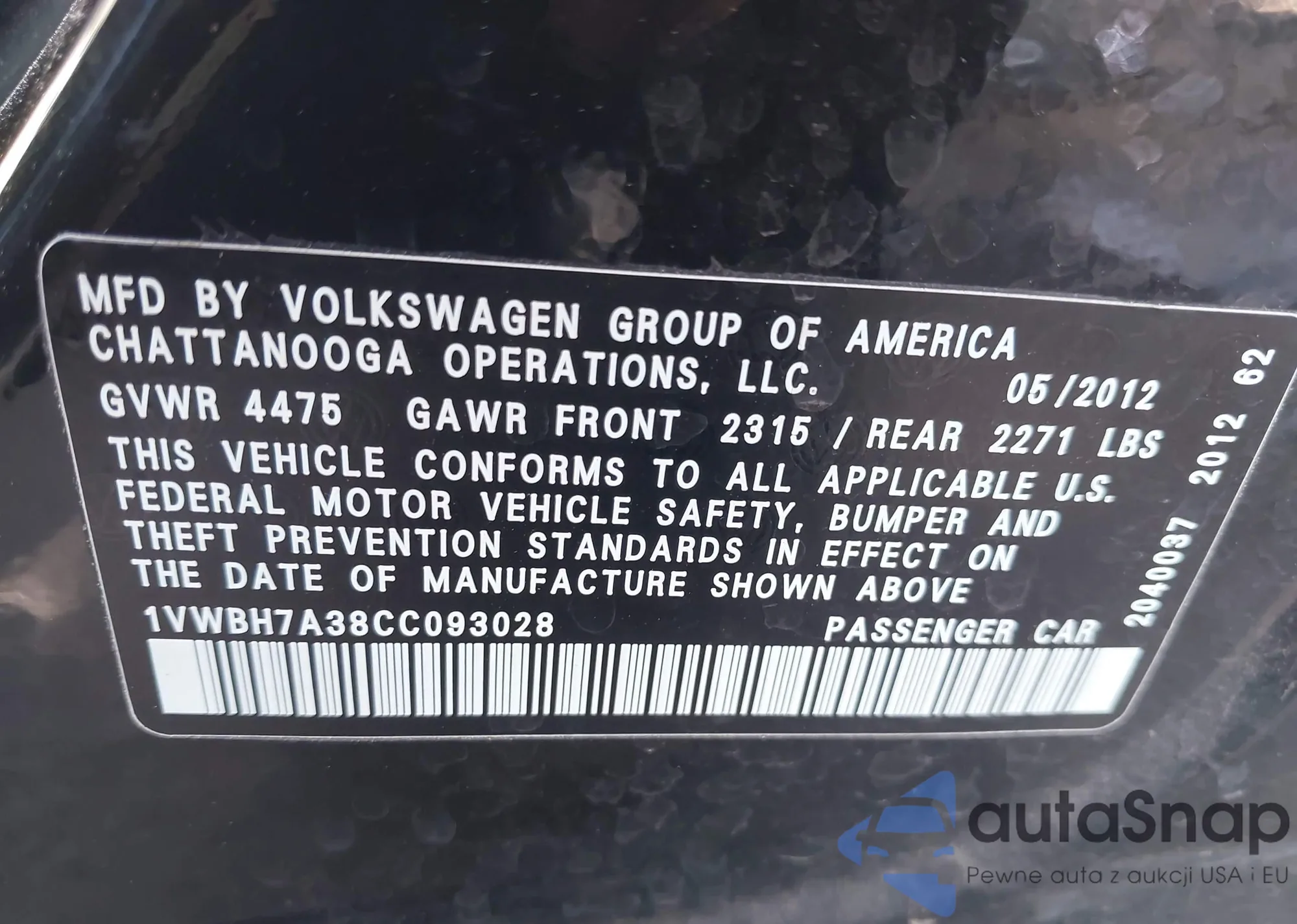 • VIN: 1VWBH7A38CC093028