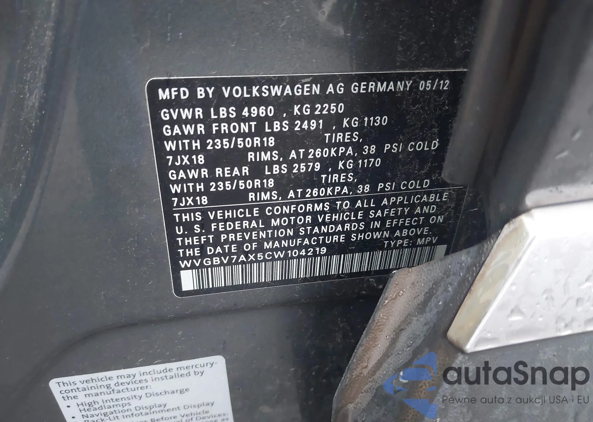 VIN: WVGBV7AX5CW104219