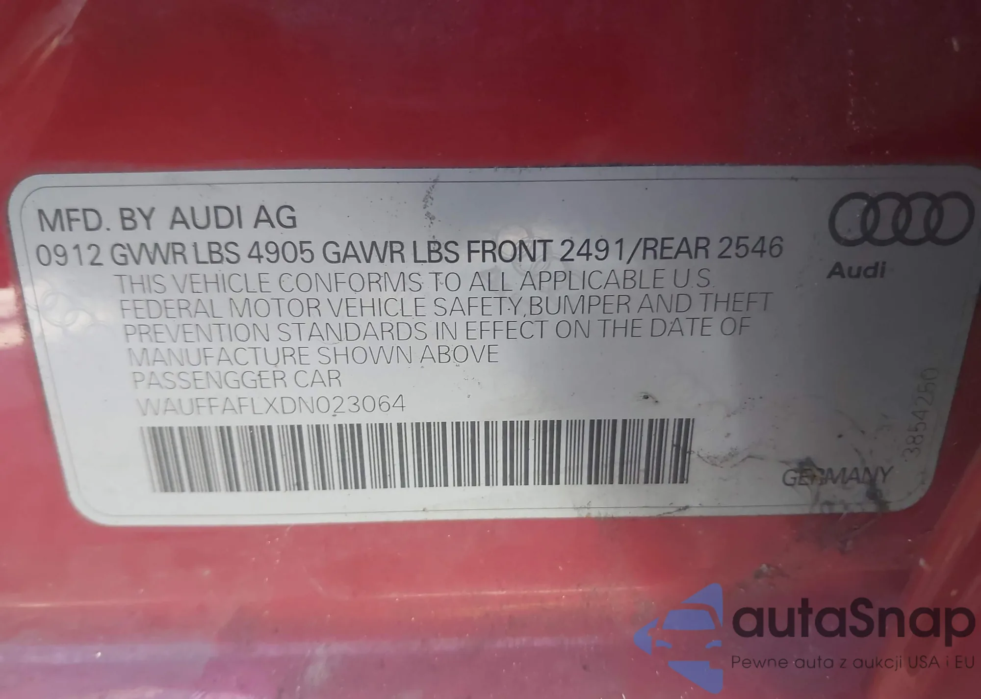 Samochód Audi A4 2013 (VIN WAUFFAFLXDN023064) ma dokumenty uniemożliwiające rejestrację. Mogą pojawić się trudności przy eksporcie i rejestracji. Skontaktuj się z ekspertami AutaSnap w celu znalezienia alternatywy.