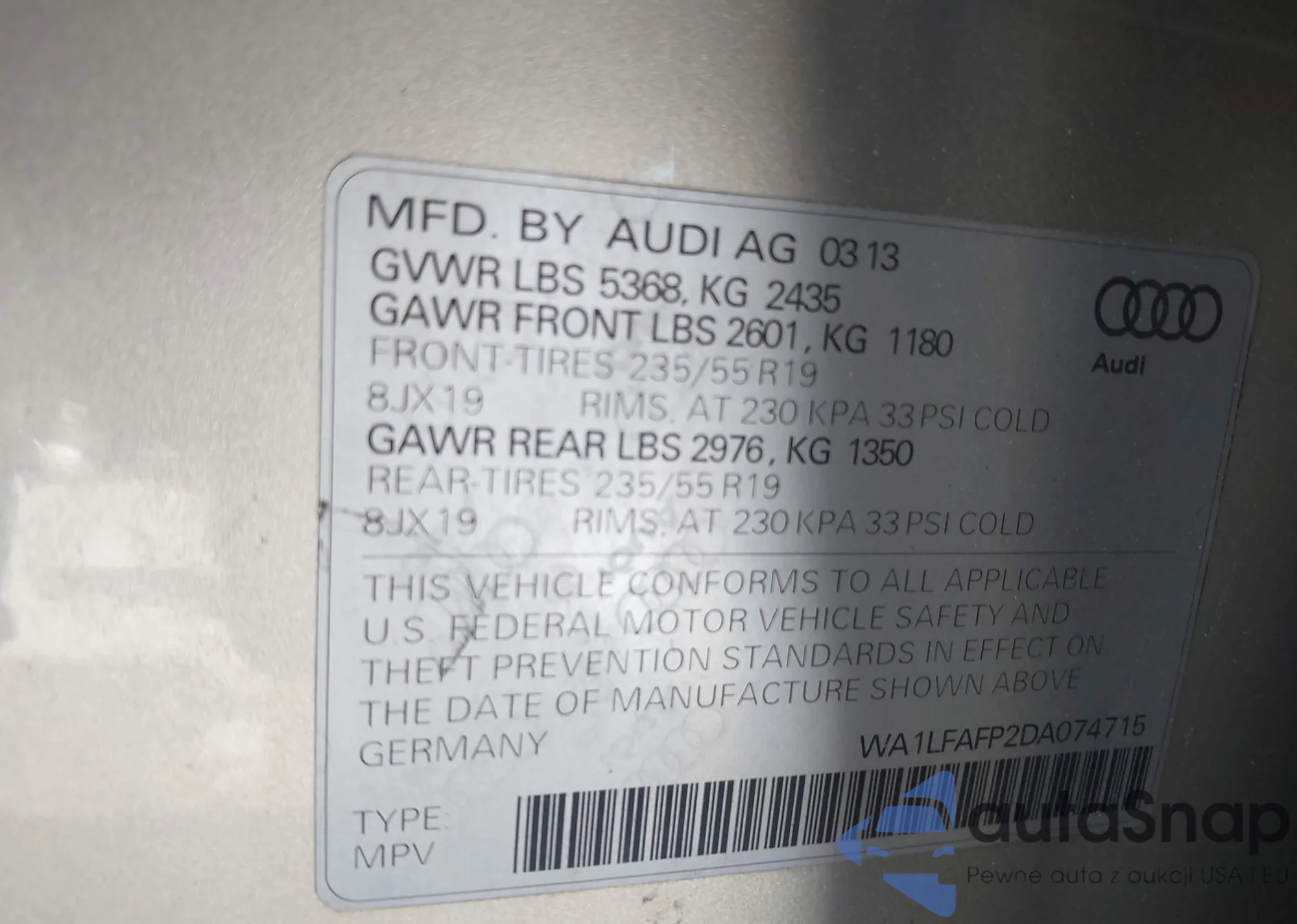 Samochód Audi Q5 2013 (VIN WA1LFAFP2DA074715) nie był wcześniej licytowany. Dokumenty są czyste, przebieg odpowiada lub jest niższy niż średnia rynku. Sprzedaje go firma ubezpieczeniowa – polecamy zakup. Dostawa do portu zajmie ok. 6–8 tygodni.