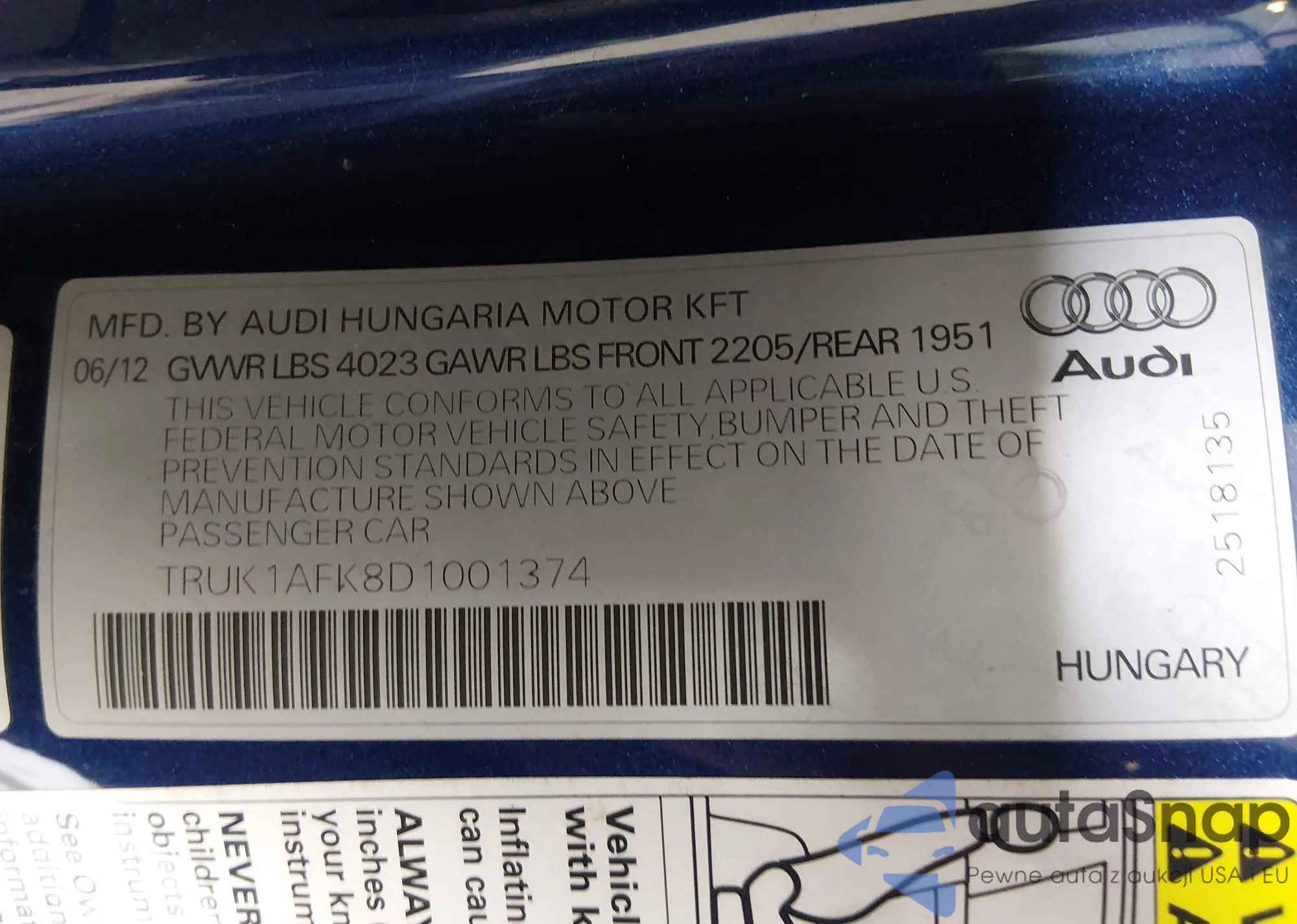 Samochód Audi TTS 2013 (VIN TRUK1AFK8D1001374) ma dokumenty uniemożliwiające rejestrację. Mogą pojawić się trudności przy eksporcie i rejestracji. Skontaktuj się z ekspertami AutaSnap w celu znalezienia alternatywy.